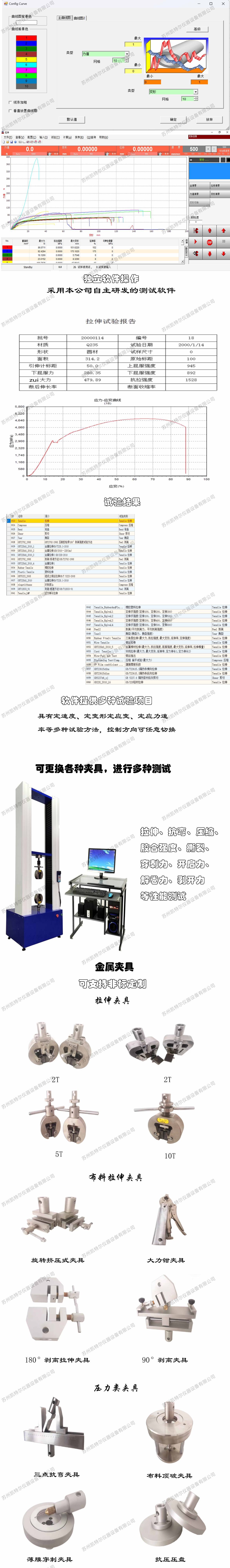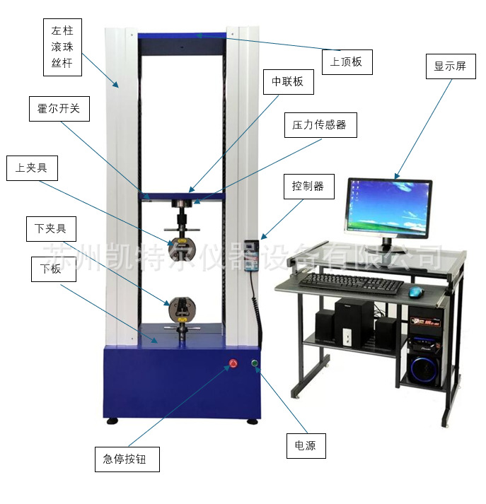 本试验机主要由电气和机械两部分组成;机械部分以电气部分之电机为原动力,利用电机之正反转,通过蜗轮与减速机将速度降到试验所需之速度,再经丝杆传动,带动中联板上下移动配合夹具实现夹具之拉压过程。试样经拉伸、压缩、撕裂或其它形式的破坏后可由显示器上直接读出拉力、压力值、撕裂力值或其它形式的力值,以求得所需之试样之物性。