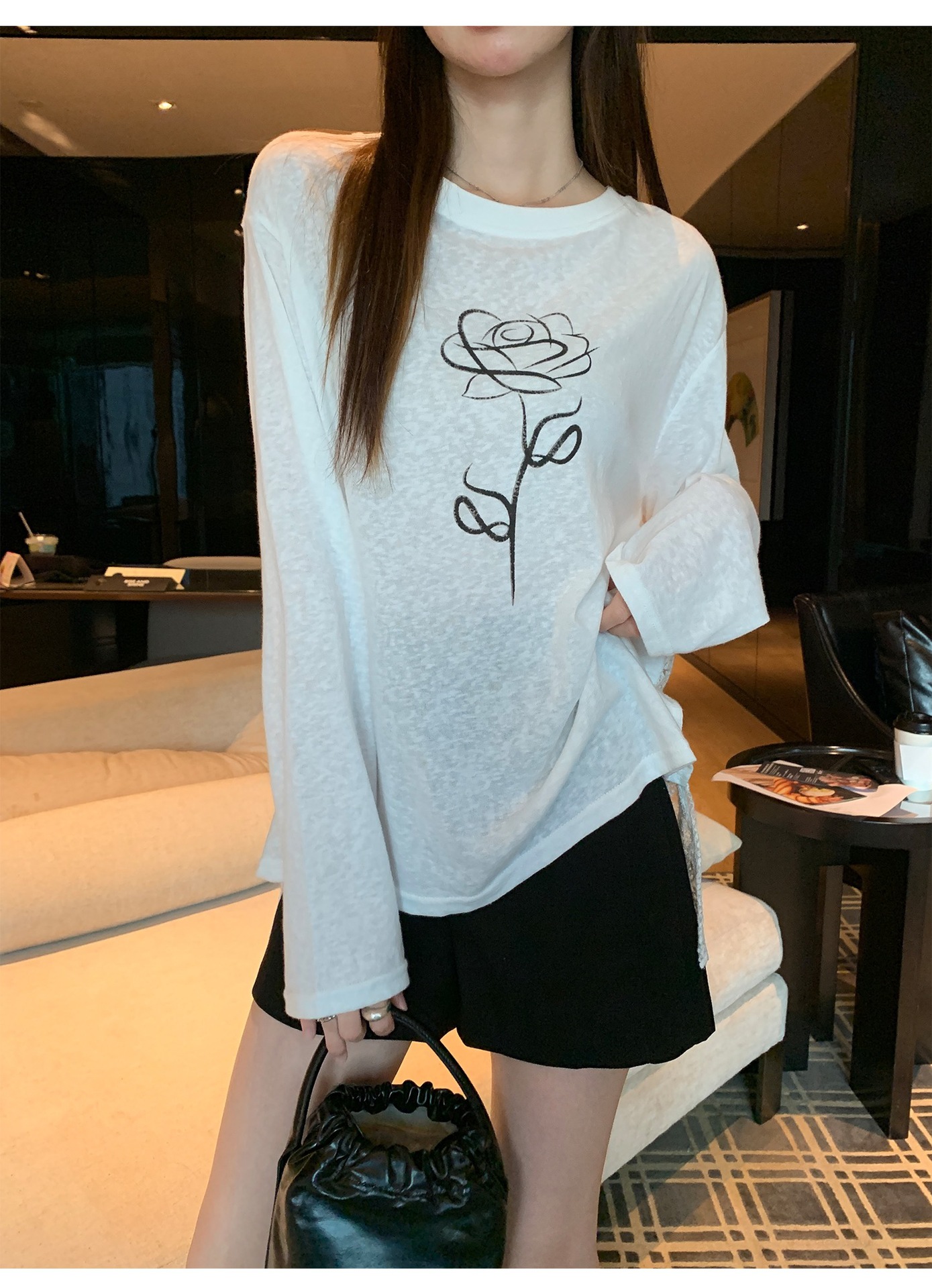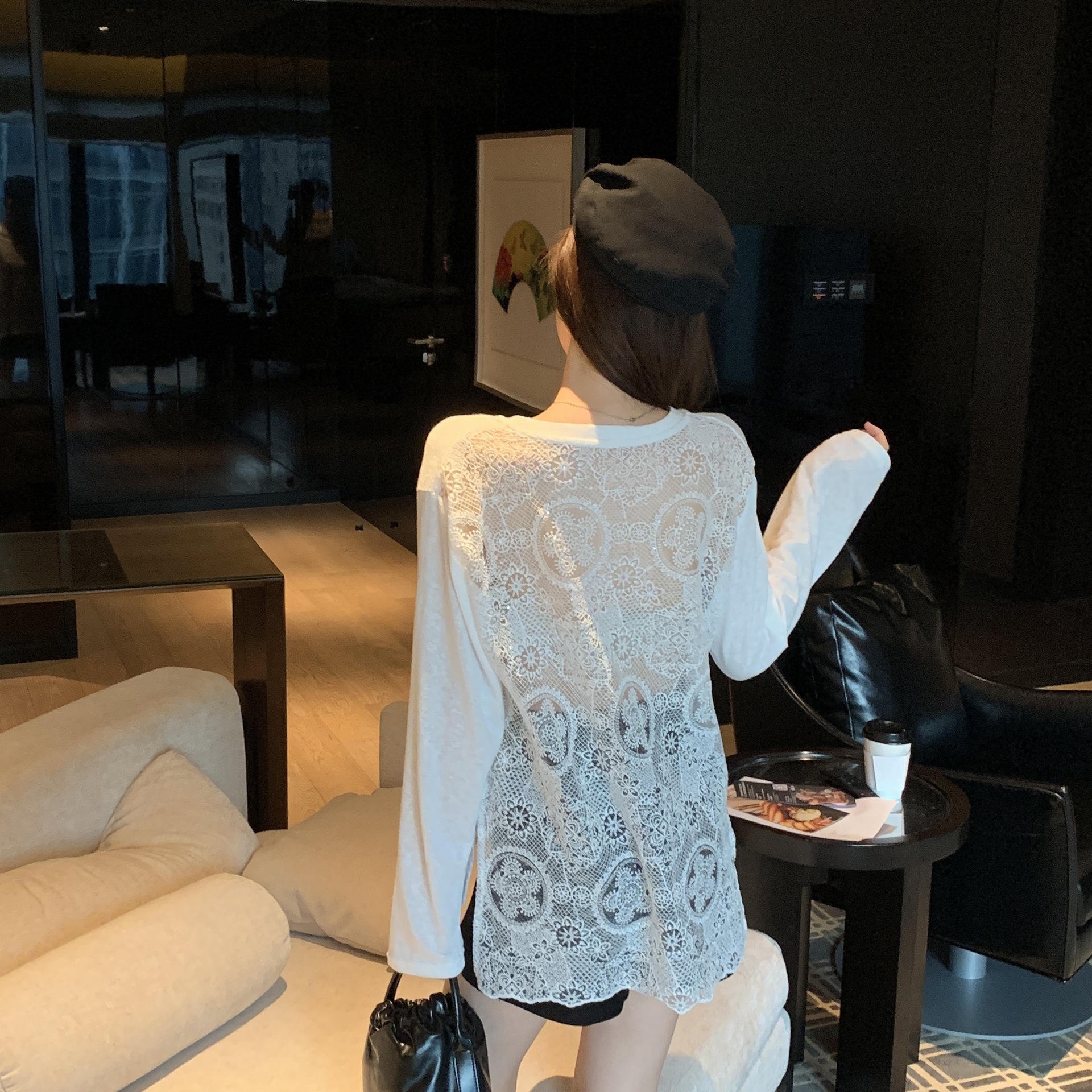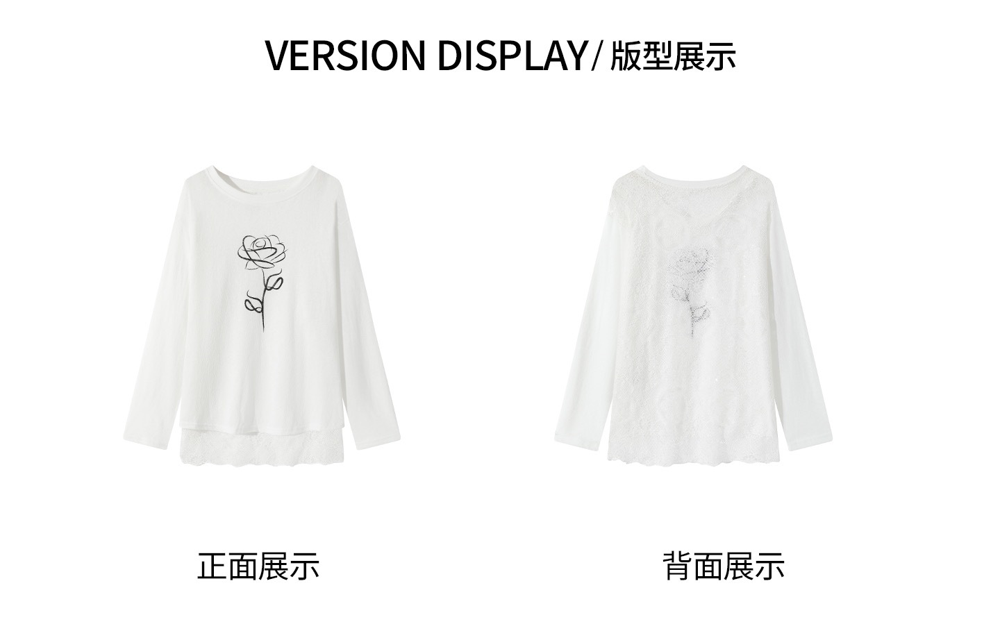BELLA白色玫瑰印花蕾丝后背镂空长袖t恤女秋季宽松内搭打底衫上衣