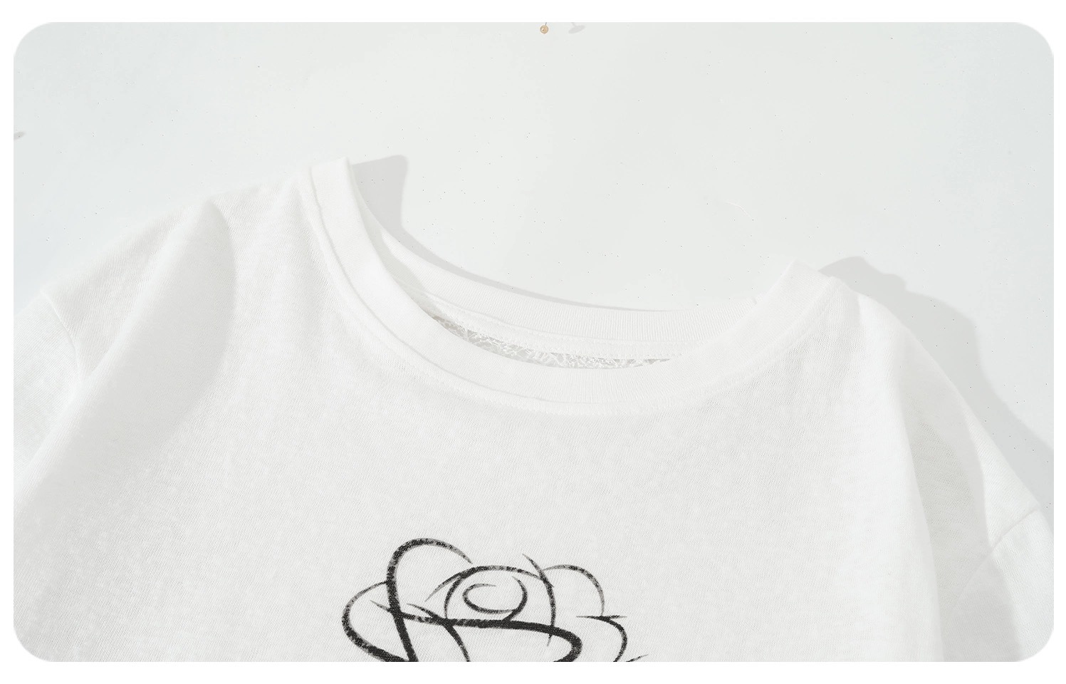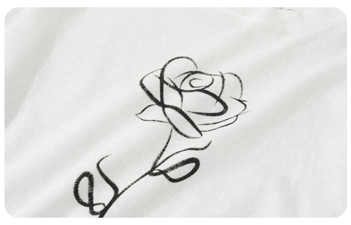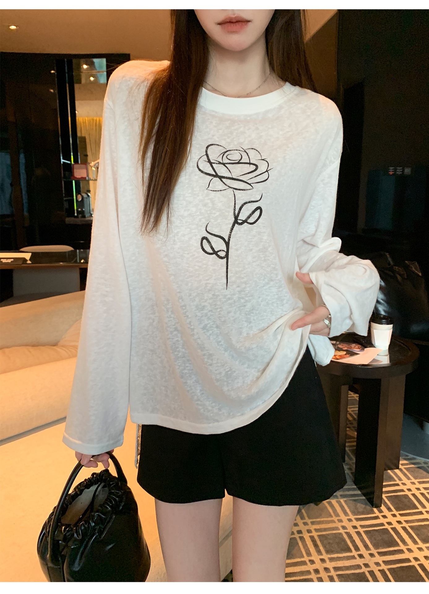 BELLA白色玫瑰印花蕾丝后背镂空长袖t恤女秋季宽松内搭打底衫上衣