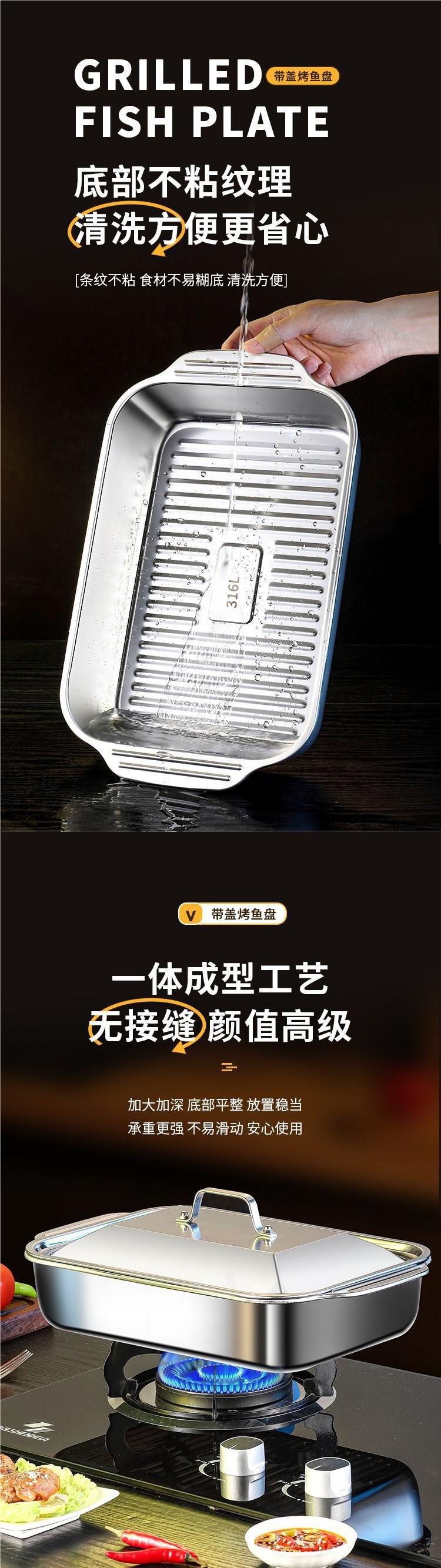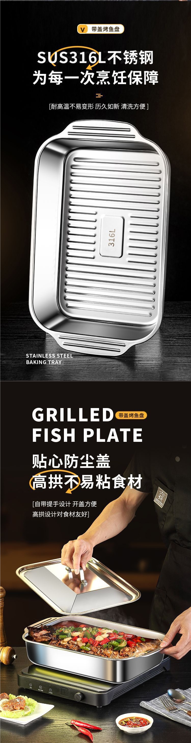 推荐理由:这款不锈钢烤鱼盘采用食品级不锈钢材质,健康安全。长方形深盘设计,容量大,适合家庭聚会和餐厅使用。不粘涂层处理,易于清洁。电磁炉、燃气灶通用,加热均匀。无论是做烤鱼、烤肉,还可当托盘使用,多功能实用!