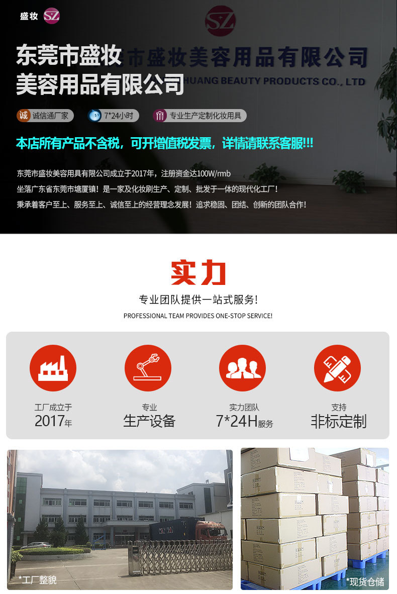 东莞市盛妆美容用品有限公司,是聚焦化妆刷领域的专业生产与贸易服务商,业务覆盖化妆刷研发生产、国内销售及进出口贸易全链条。