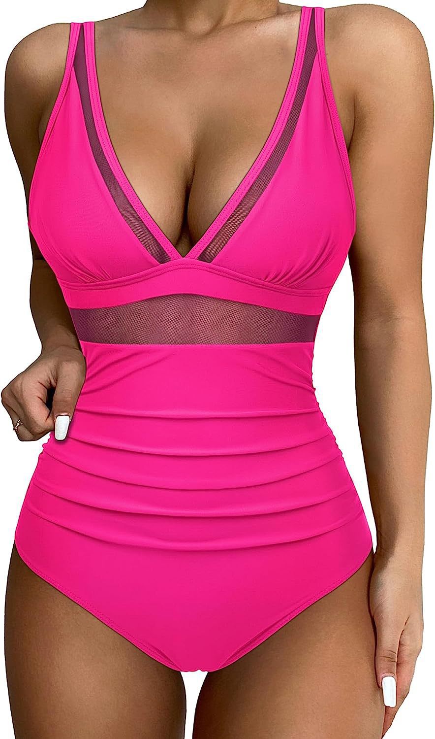 欧美跨境爆款连体泳衣性感镂空网纱深V聚拢透视比基尼bikini泳装