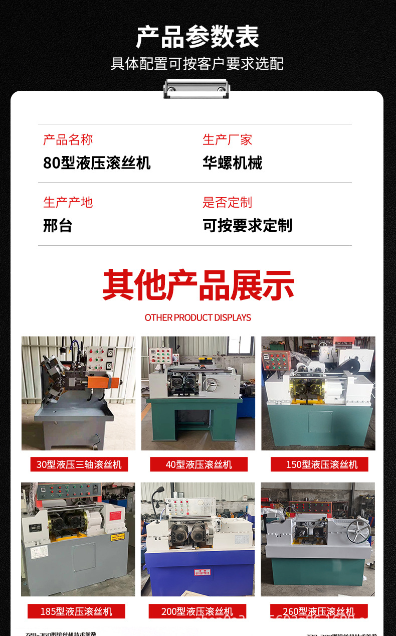 推荐理由:华螺定做80型液压滚丝机全自动滚丝机直螺纹滚牙机小型液压滚