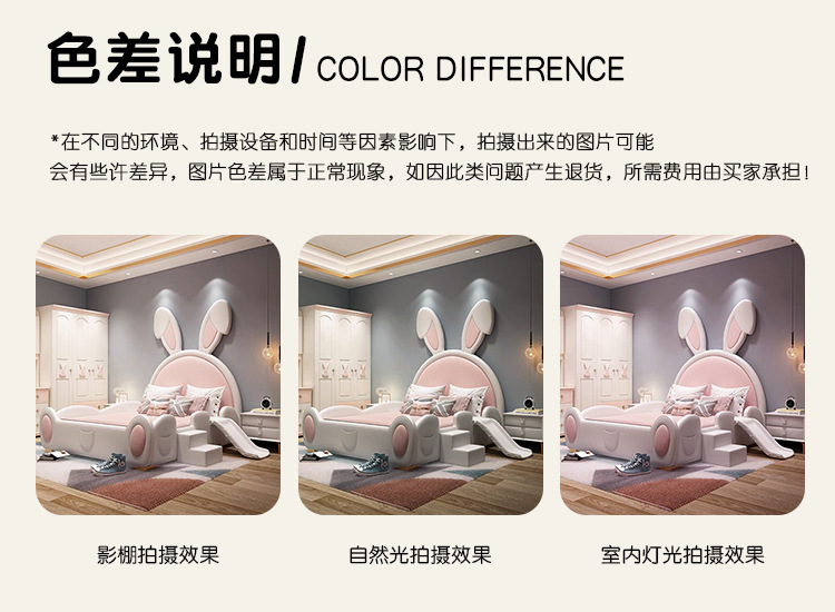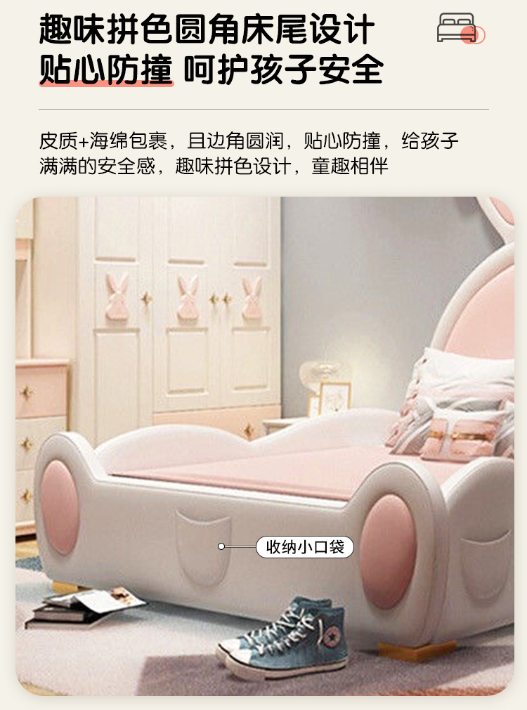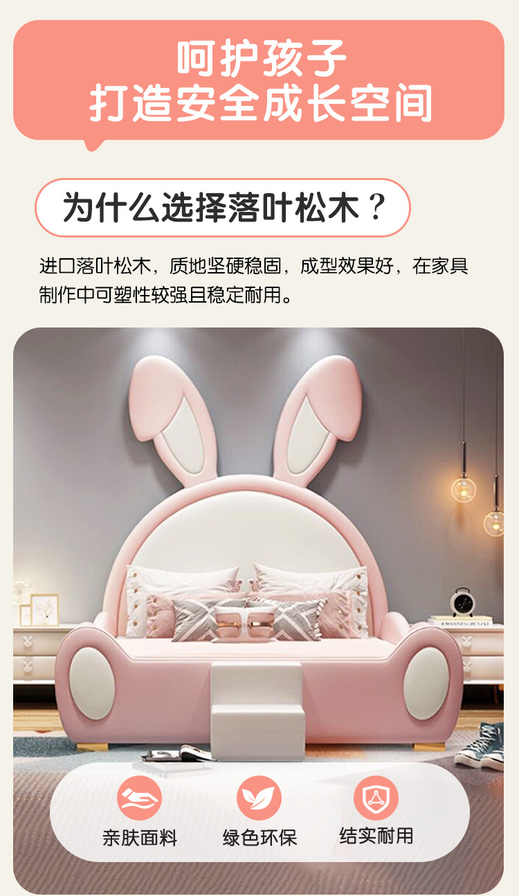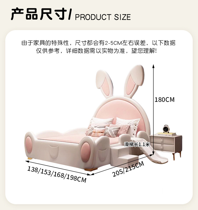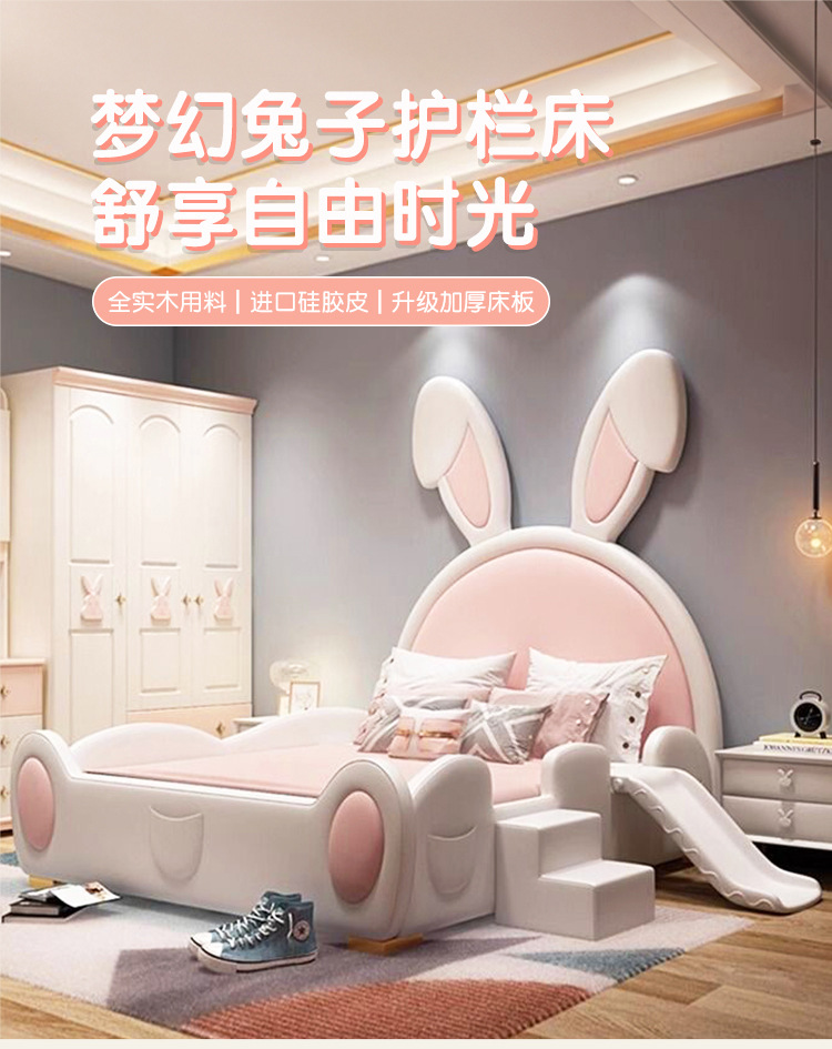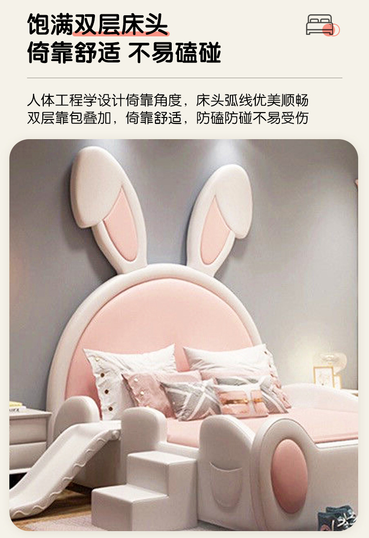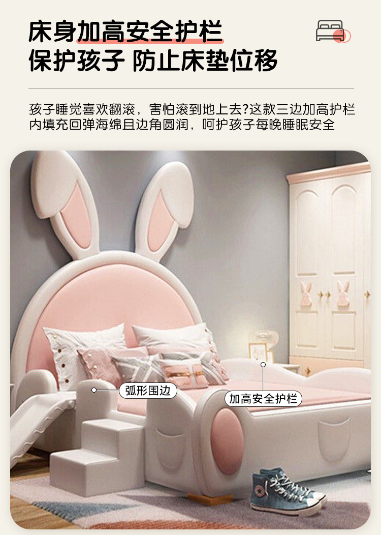 粉色儿童床女孩兔子床带滑梯护栏小户型滑梯床简约轻奢实木公主床