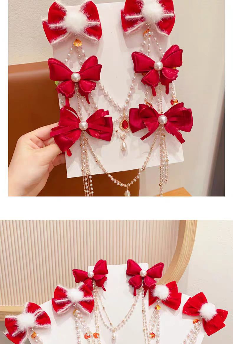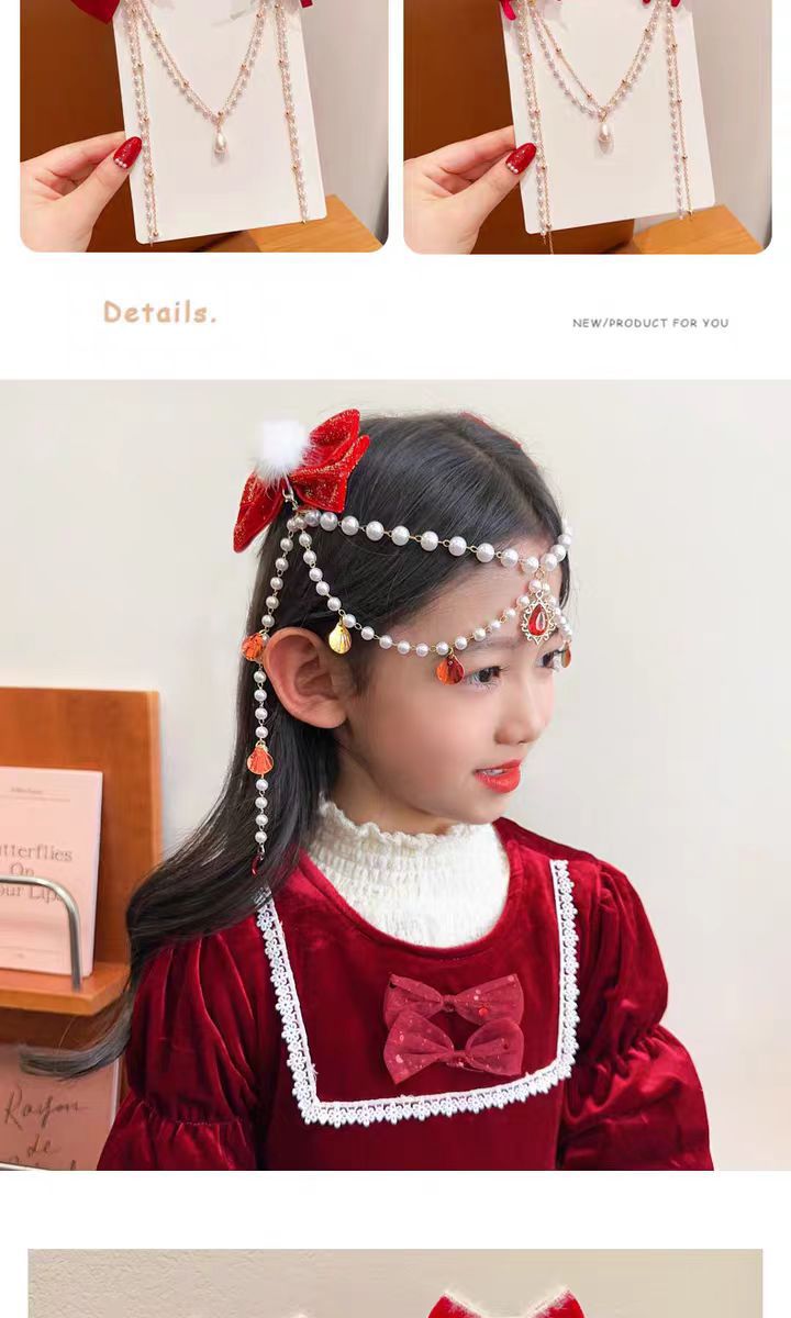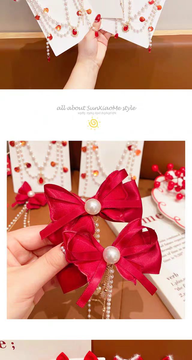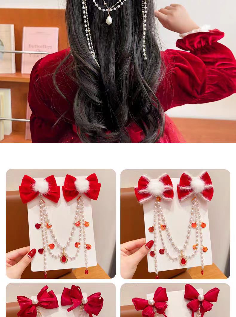 儿童红色蝴蝶结发夹新年女童公主后脑勺发链宝宝超仙对夹过年头饰