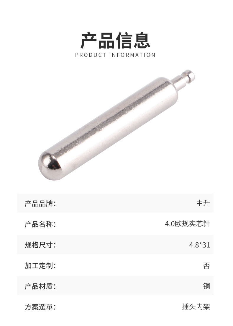 厂家供应4.0欧规实心针连接器插针4.8*31铜插头内架配件现货批发