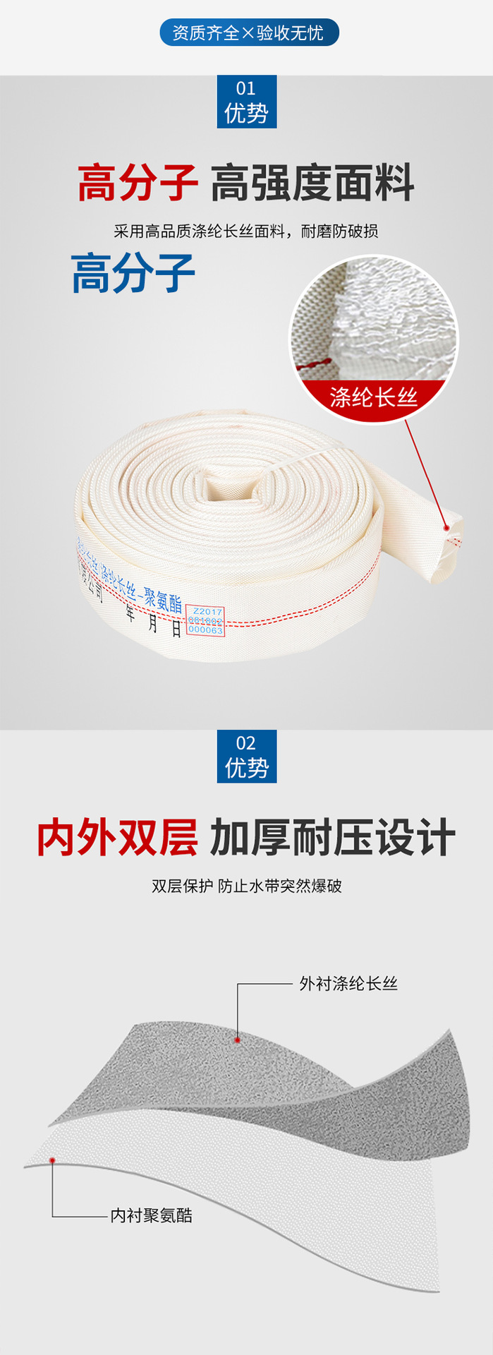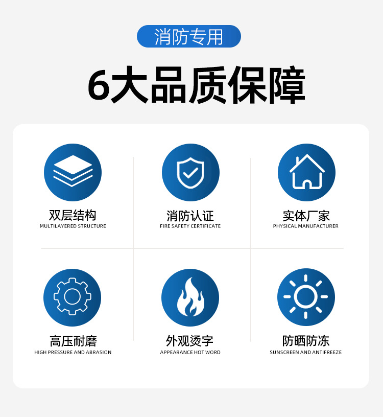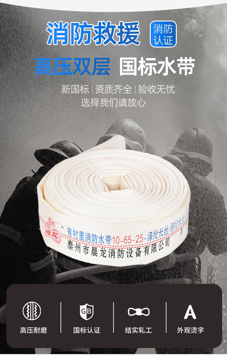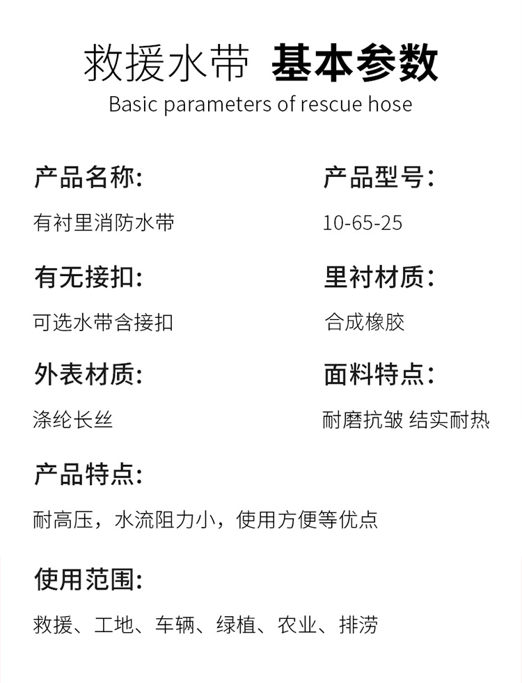 关键词:25米消防水带10-65-20有衬里水枪接口耐磨高压排涝抢险