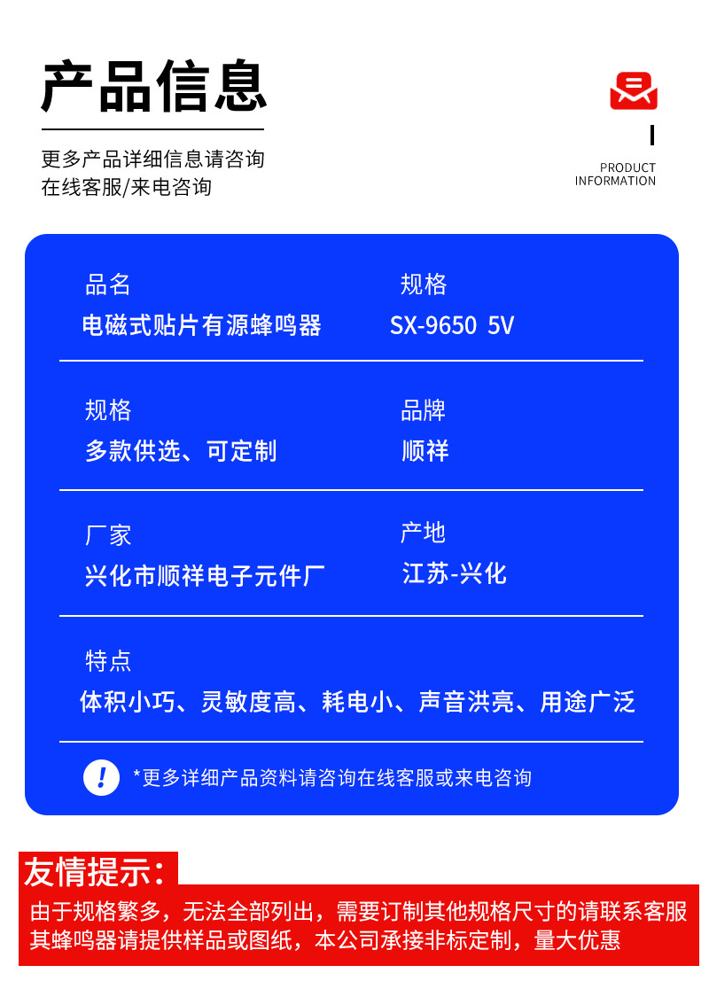 推荐理由:电磁式蜂鸣器SX-9650有源贴片蜂鸣器3V 5V 12V蜂鸣器