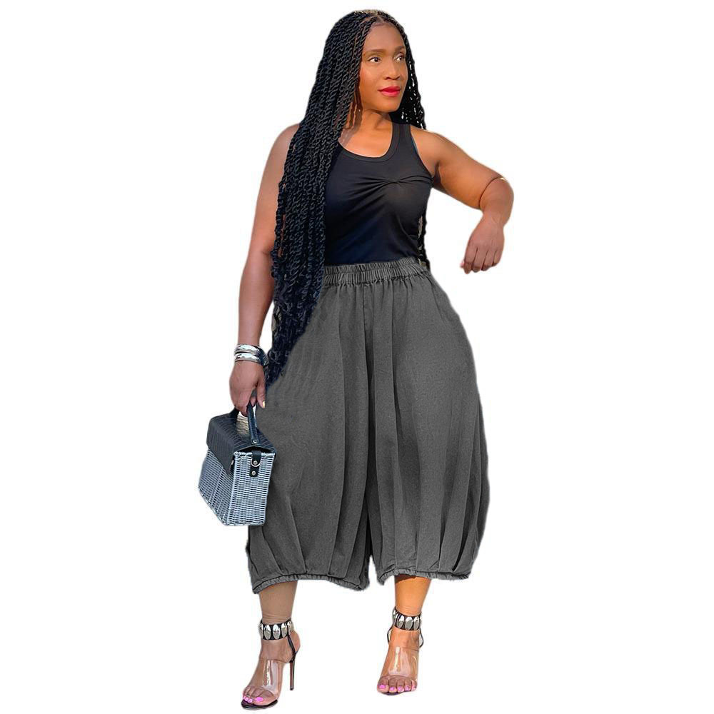 欧美女式休闲牛仔裤亚马逊跨境女装街头百搭松紧腰直筒阔腿七分裤