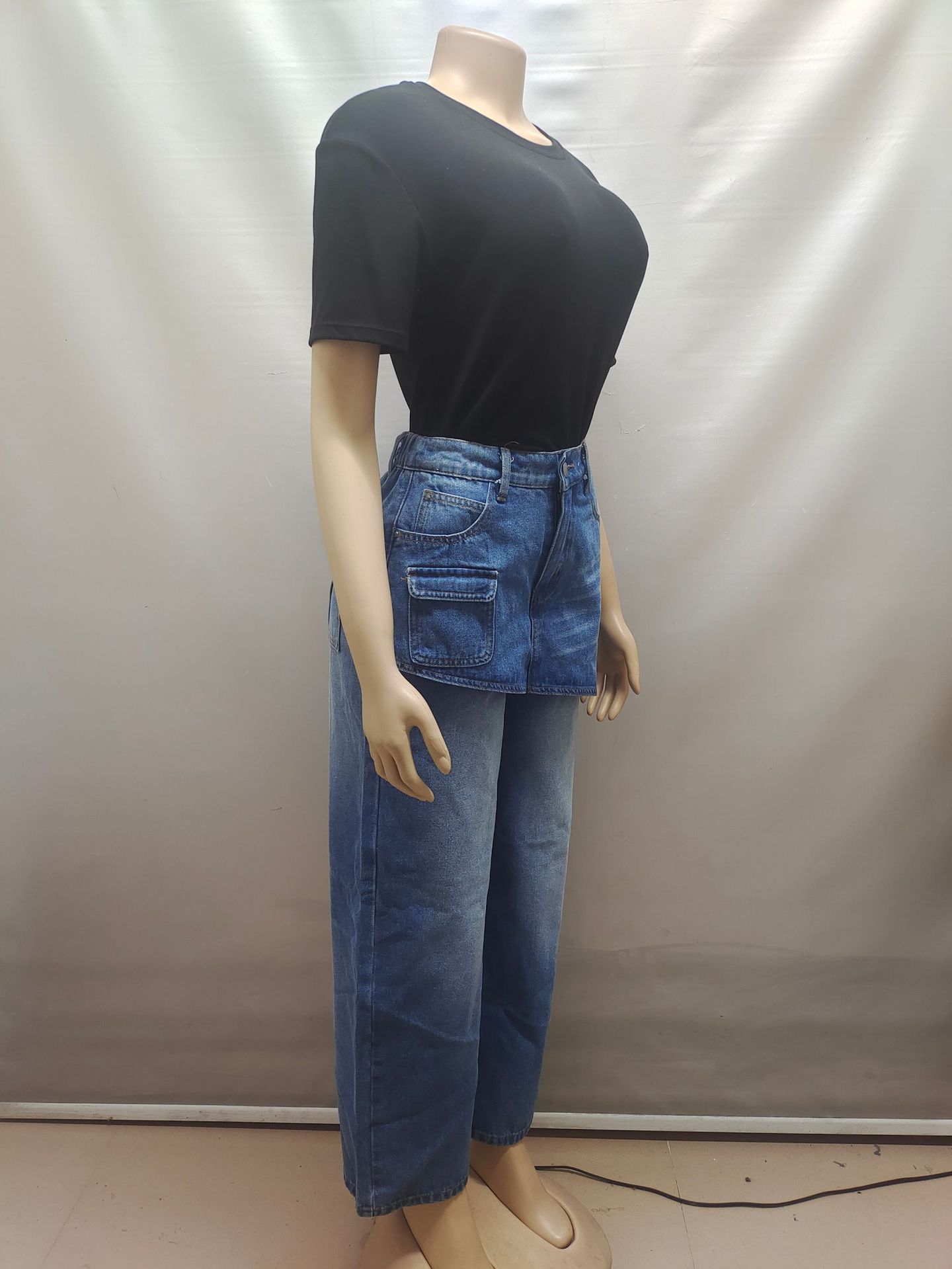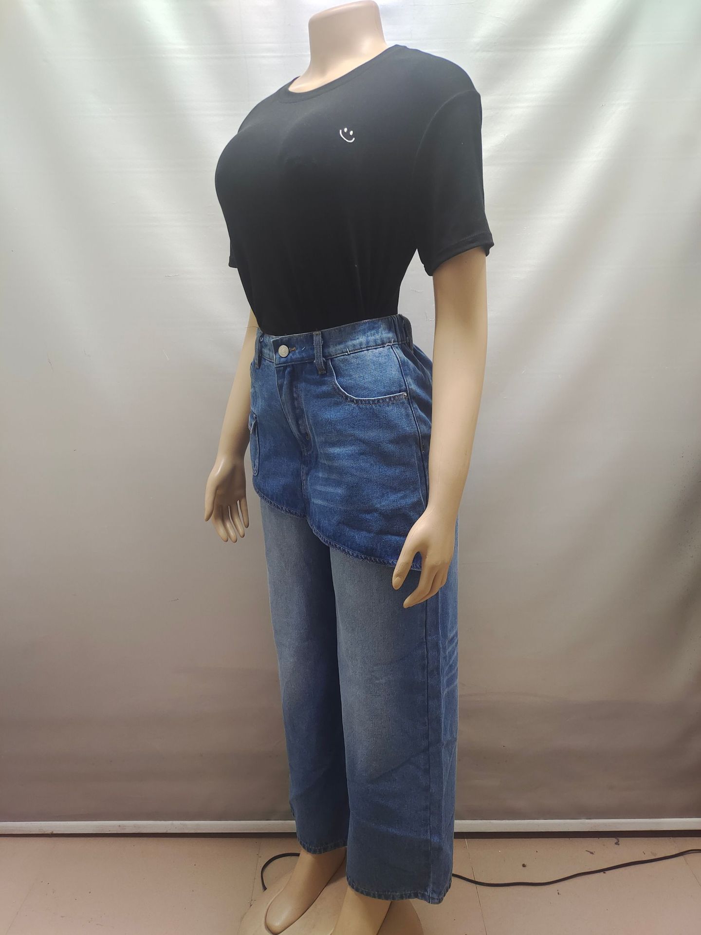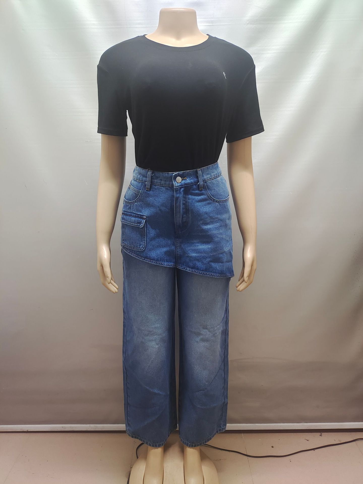 欧美女式假裙牛仔裤亚马逊跨境女装时尚个性拼接高腰短裙直筒长裤