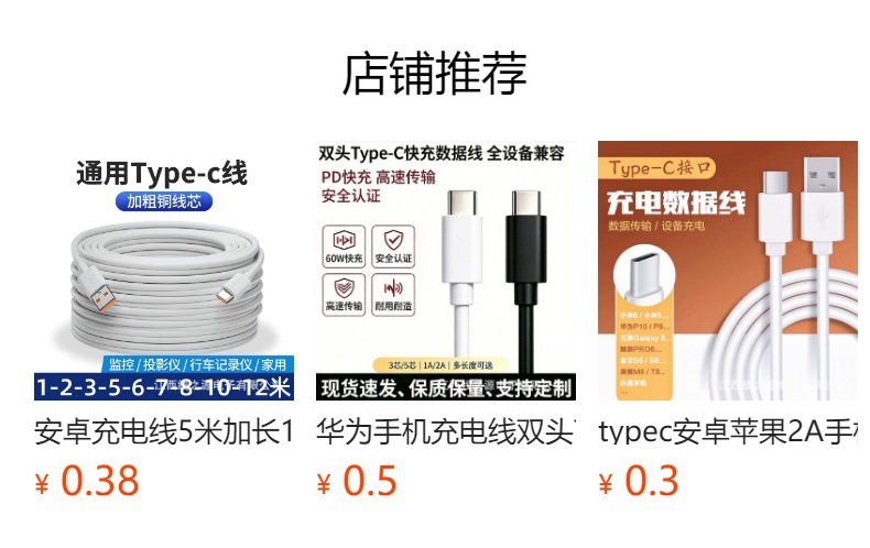 加工定制type-c面条充电线1米数据线移动USB电源配机扁线2A快充线