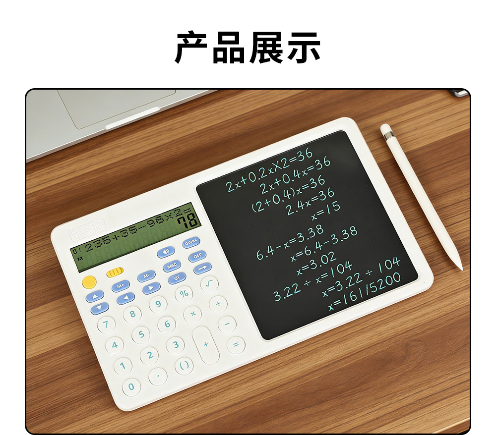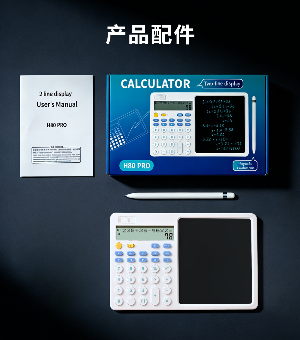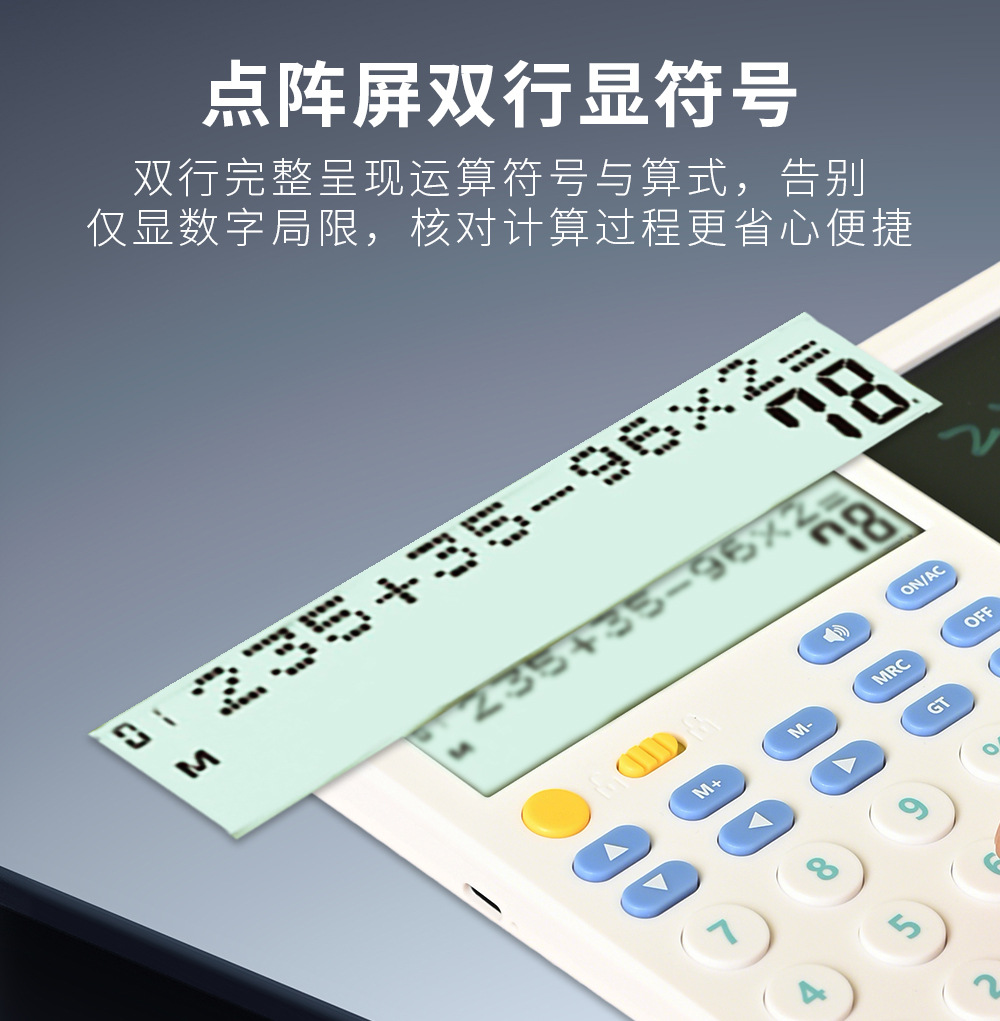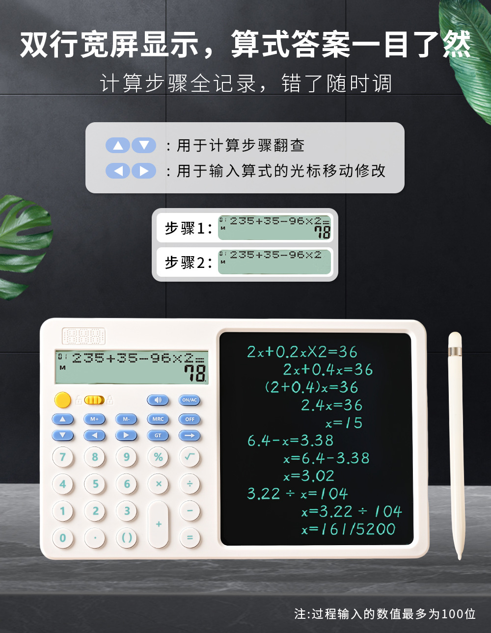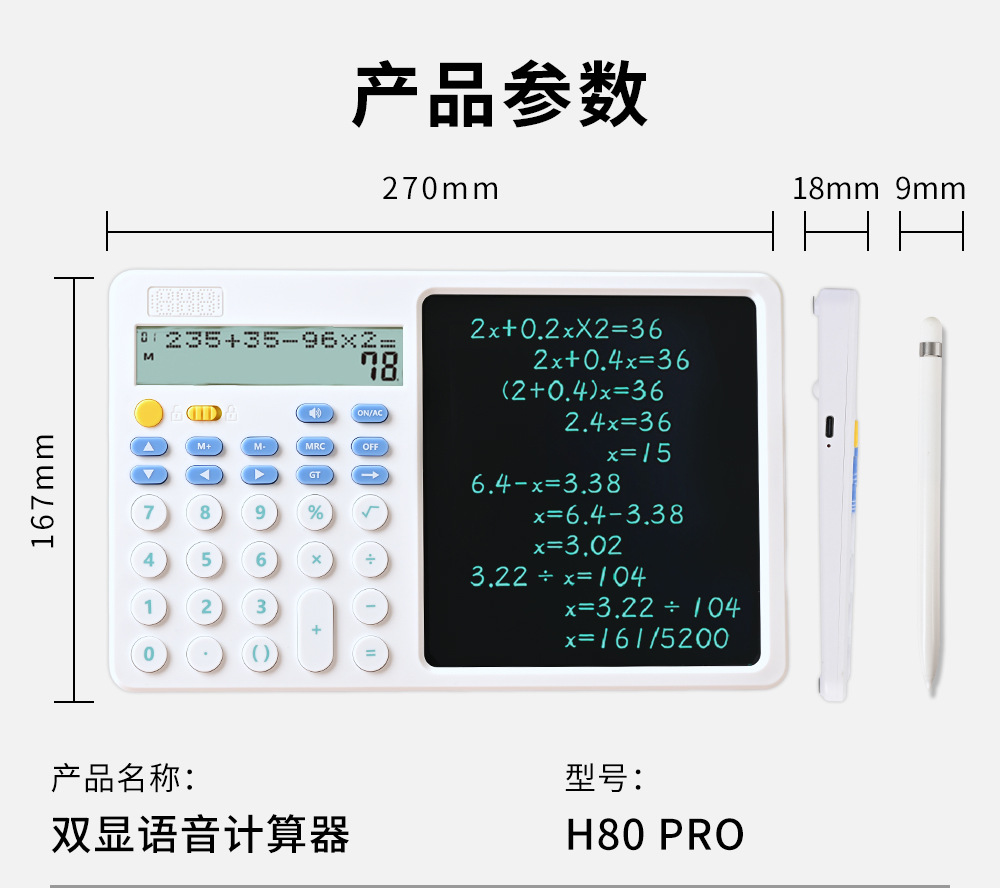关键词:双行显示,真人语音,四则混合计算,翻查步骤,修改算式,手写板