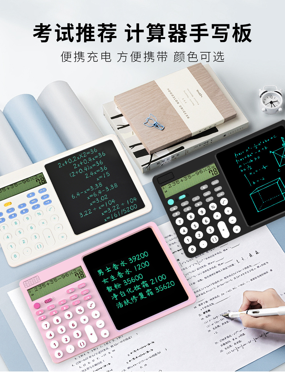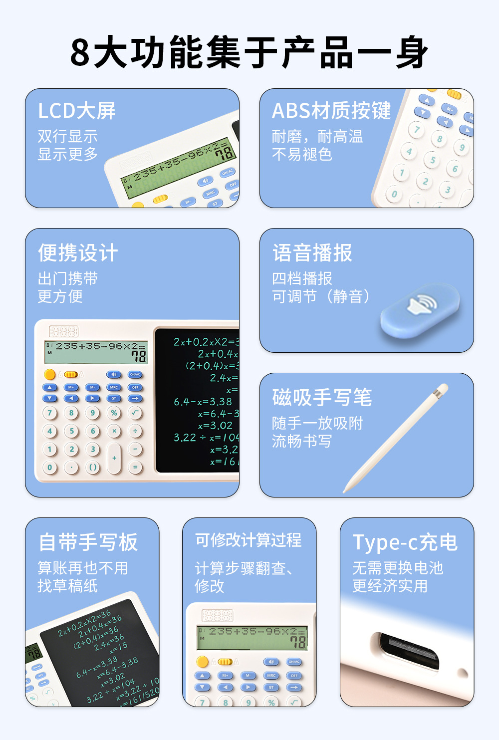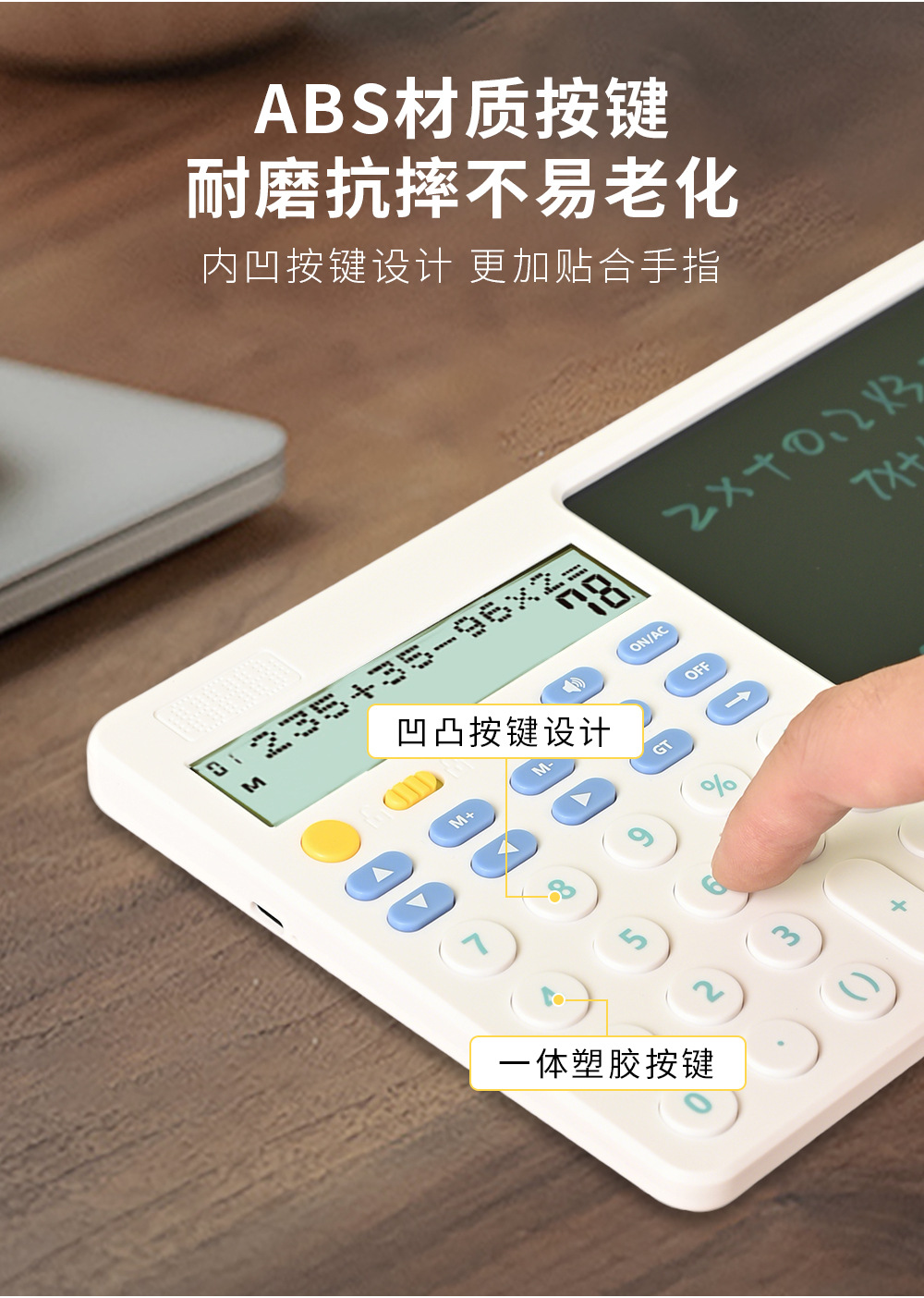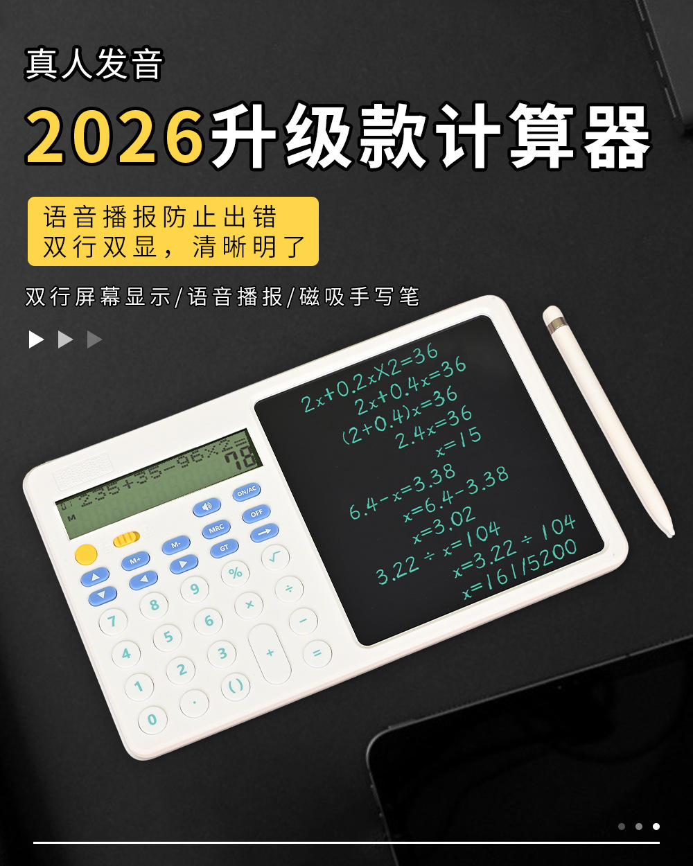 关键词:双行显示,真人语音,四则混合计算,翻查步骤,修改算式,手写板