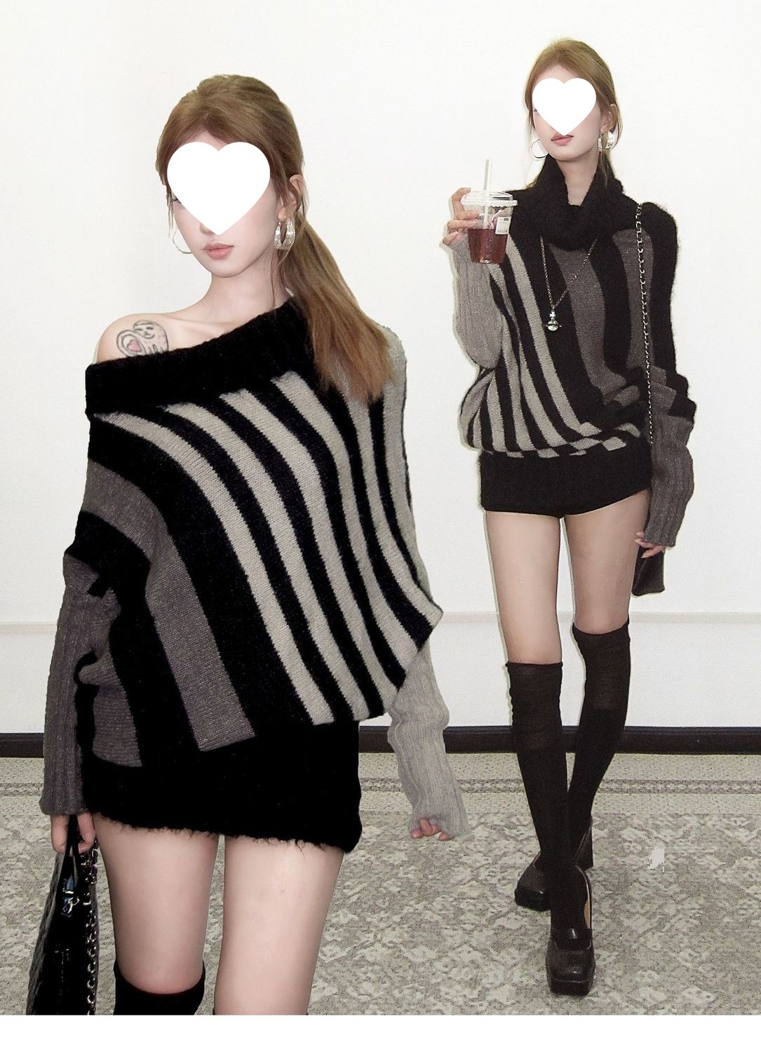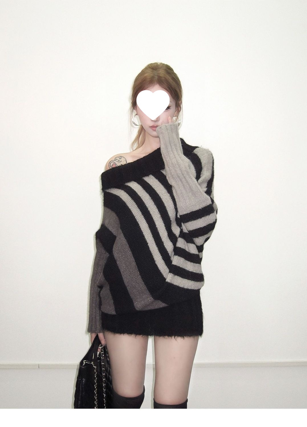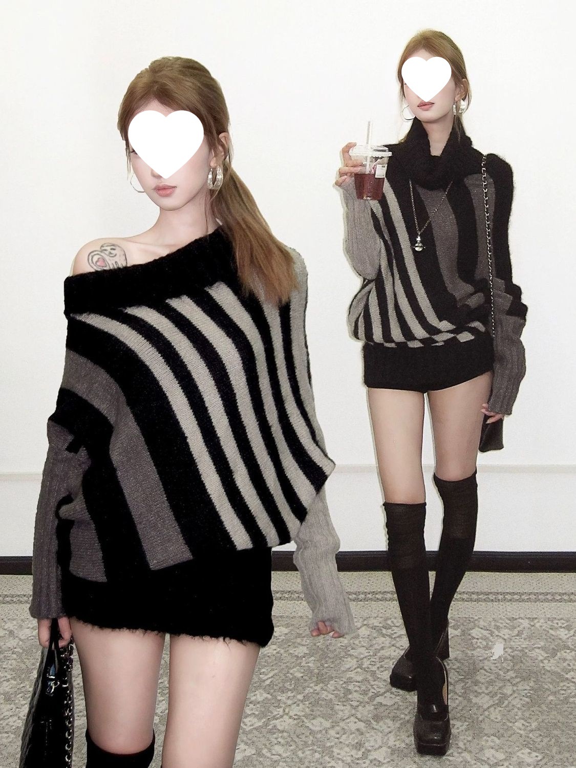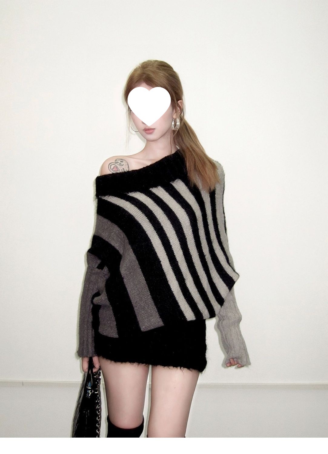 蝙蝠衫uiua可撞色黑白反穿R古早上下条纹毛衣造型混纺nr多灰