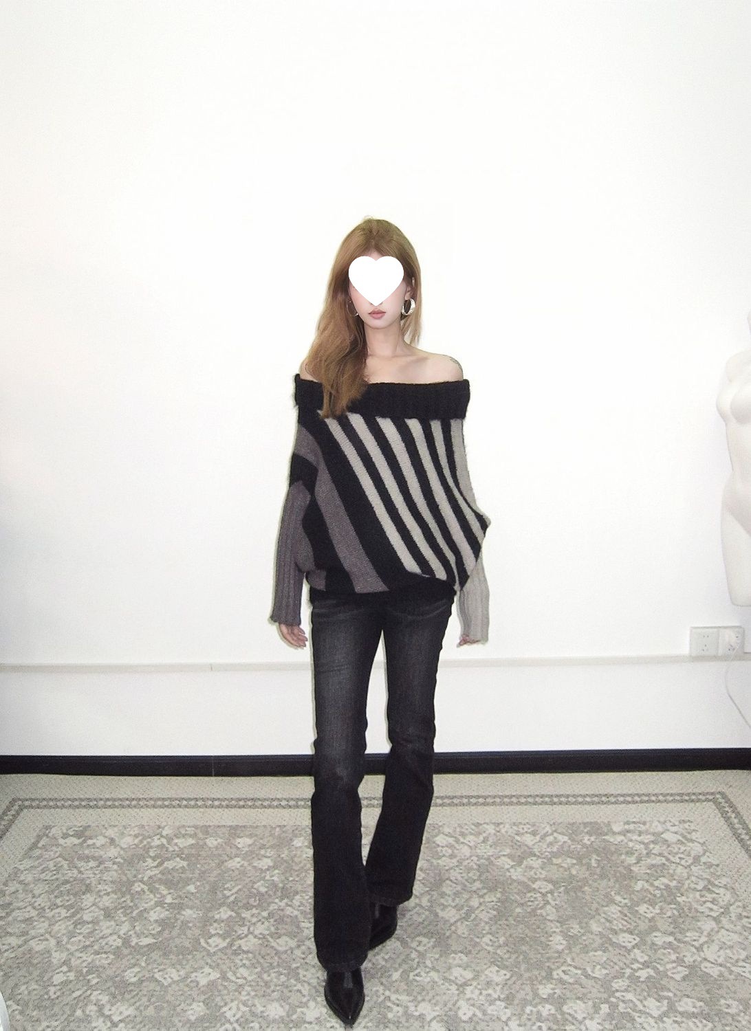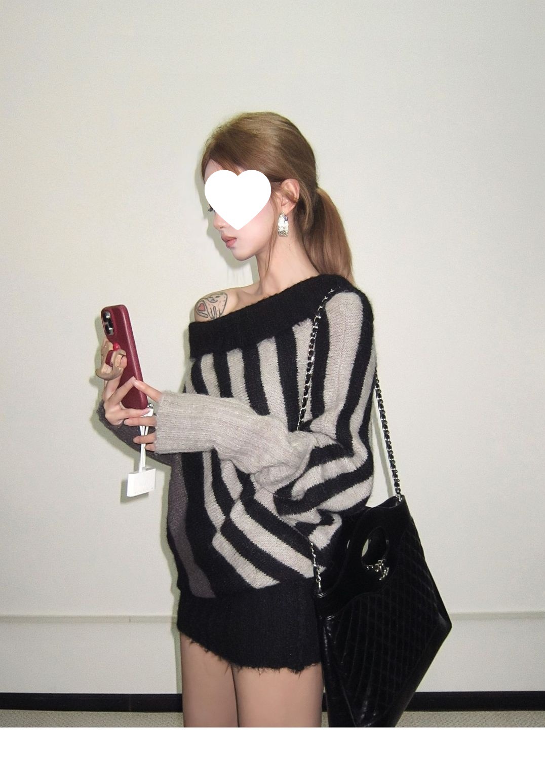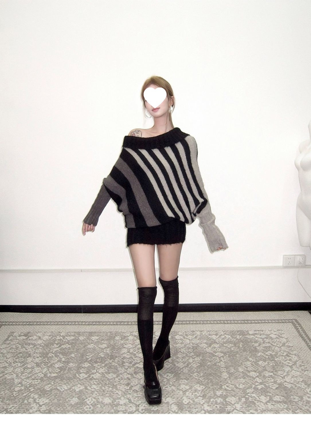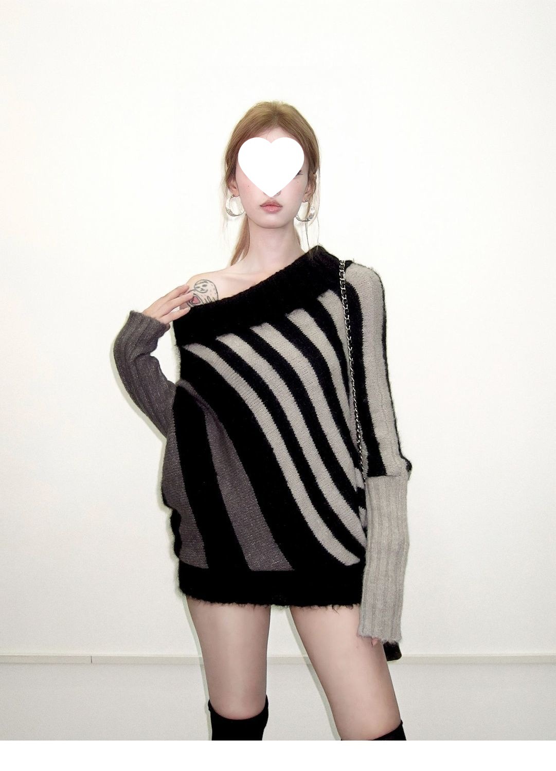 蝙蝠衫uiua可撞色黑白反穿R古早上下条纹毛衣造型混纺nr多灰