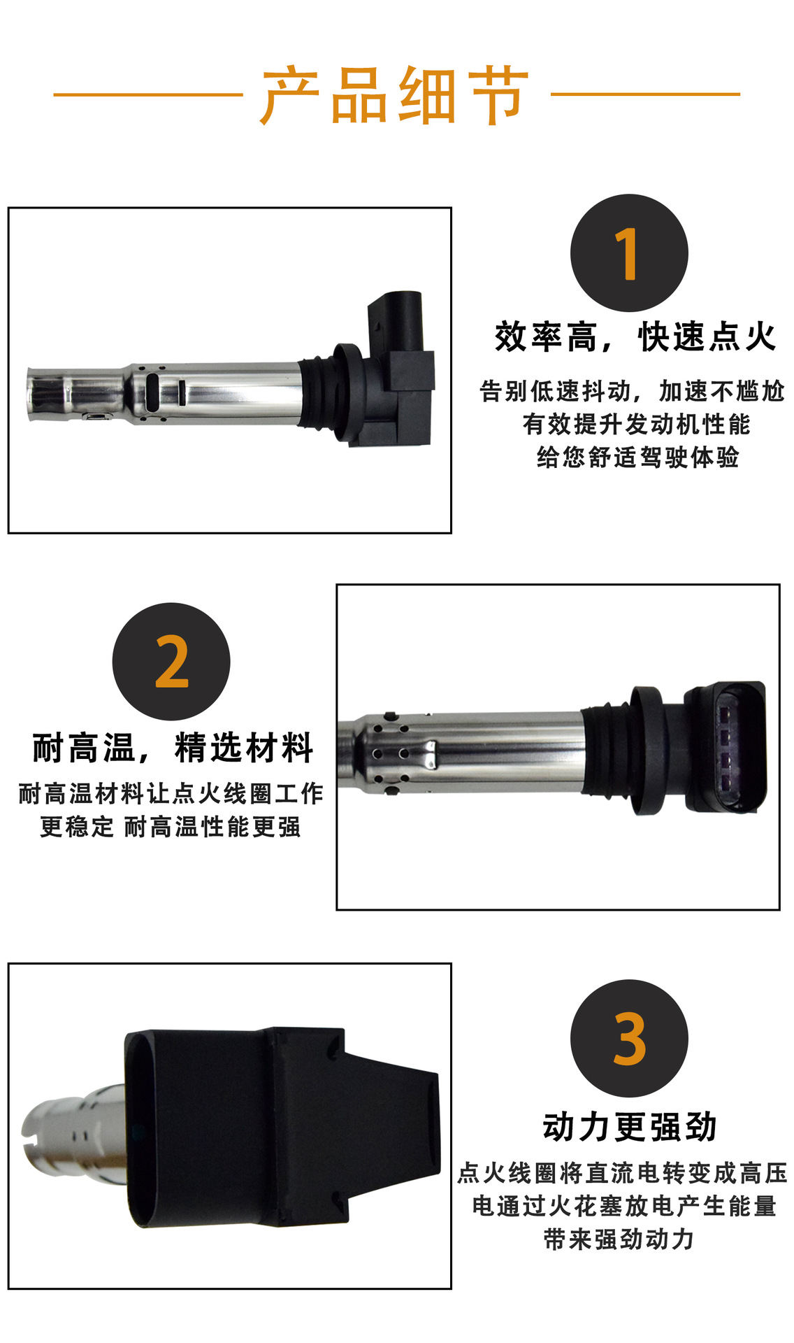 耐用材料:使用高质量绝缘材料和耐高温组件,增强点火线圈的稳定性和寿命,适应各种恶劣工作环境。