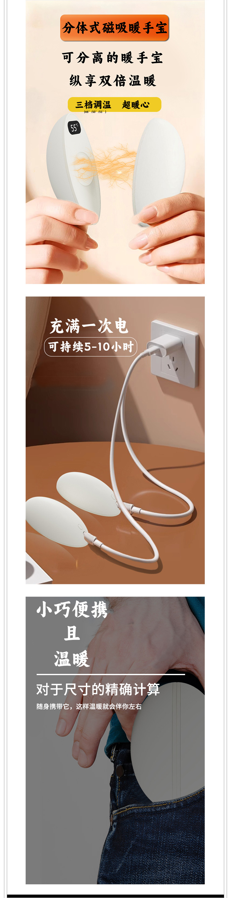 关键词:暖手宝,充电款暖手宝,二合一磁吸分体式电暖宝,便携暖宝宝