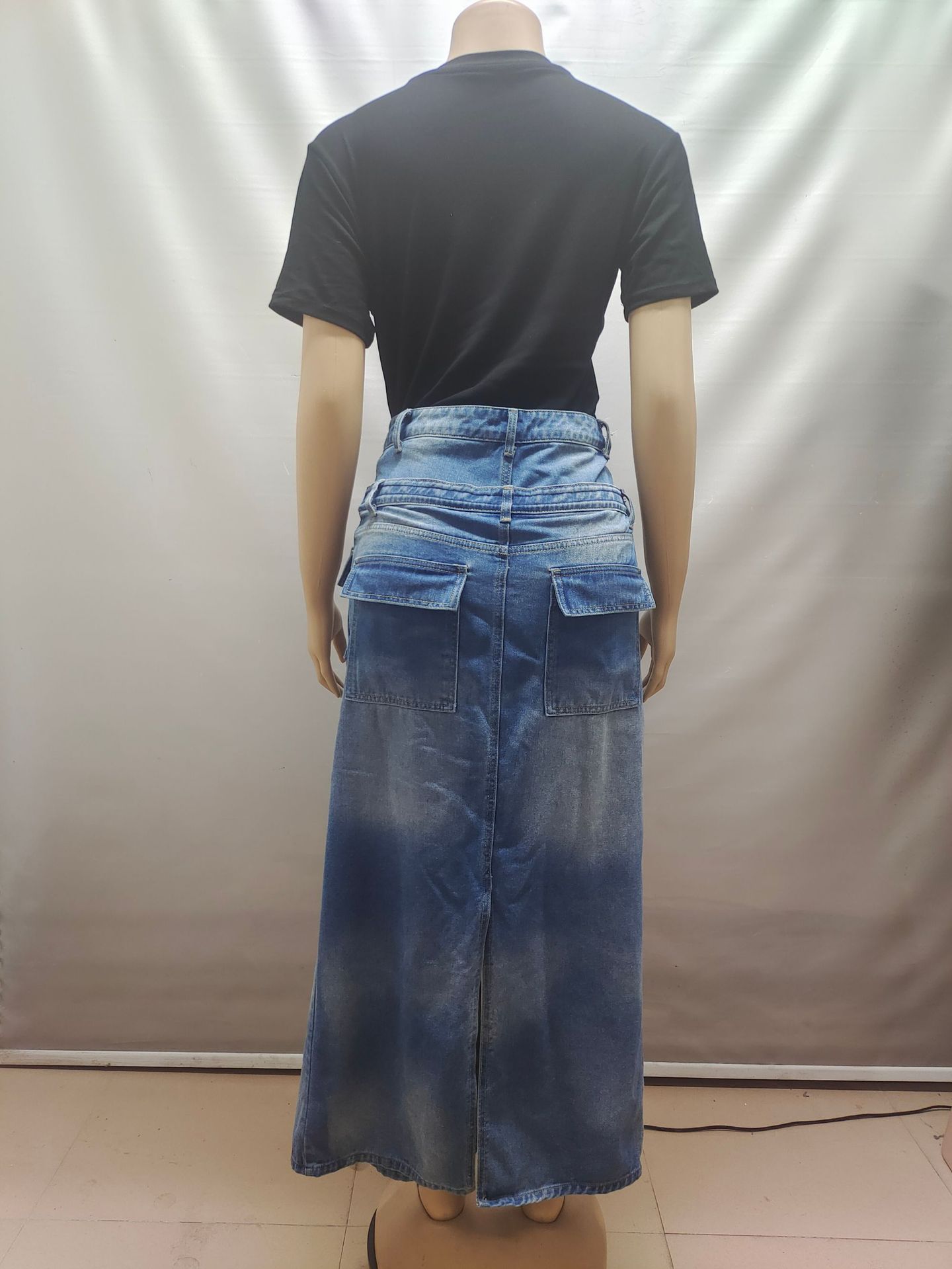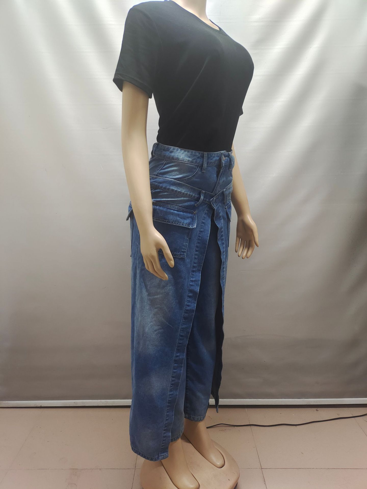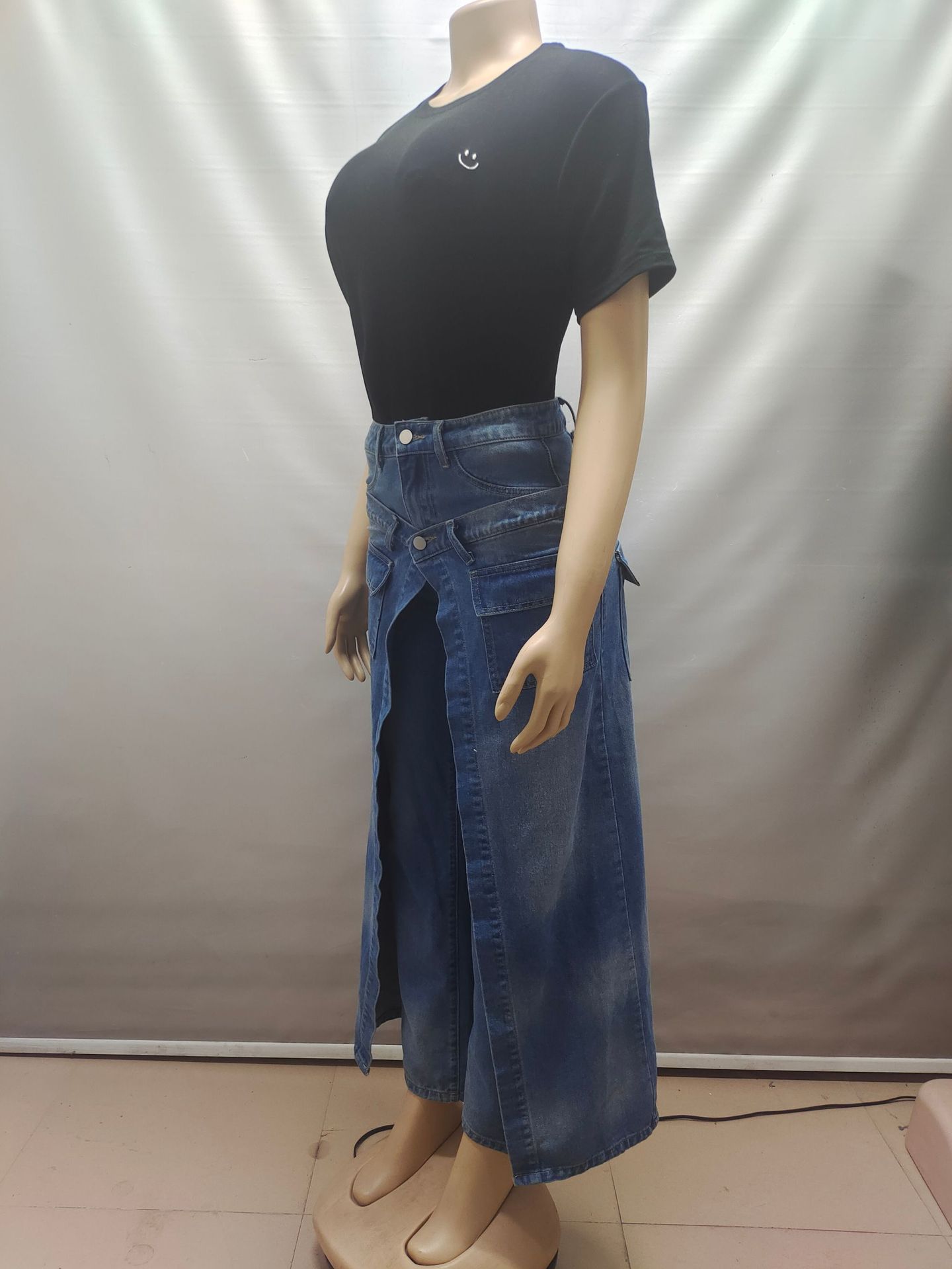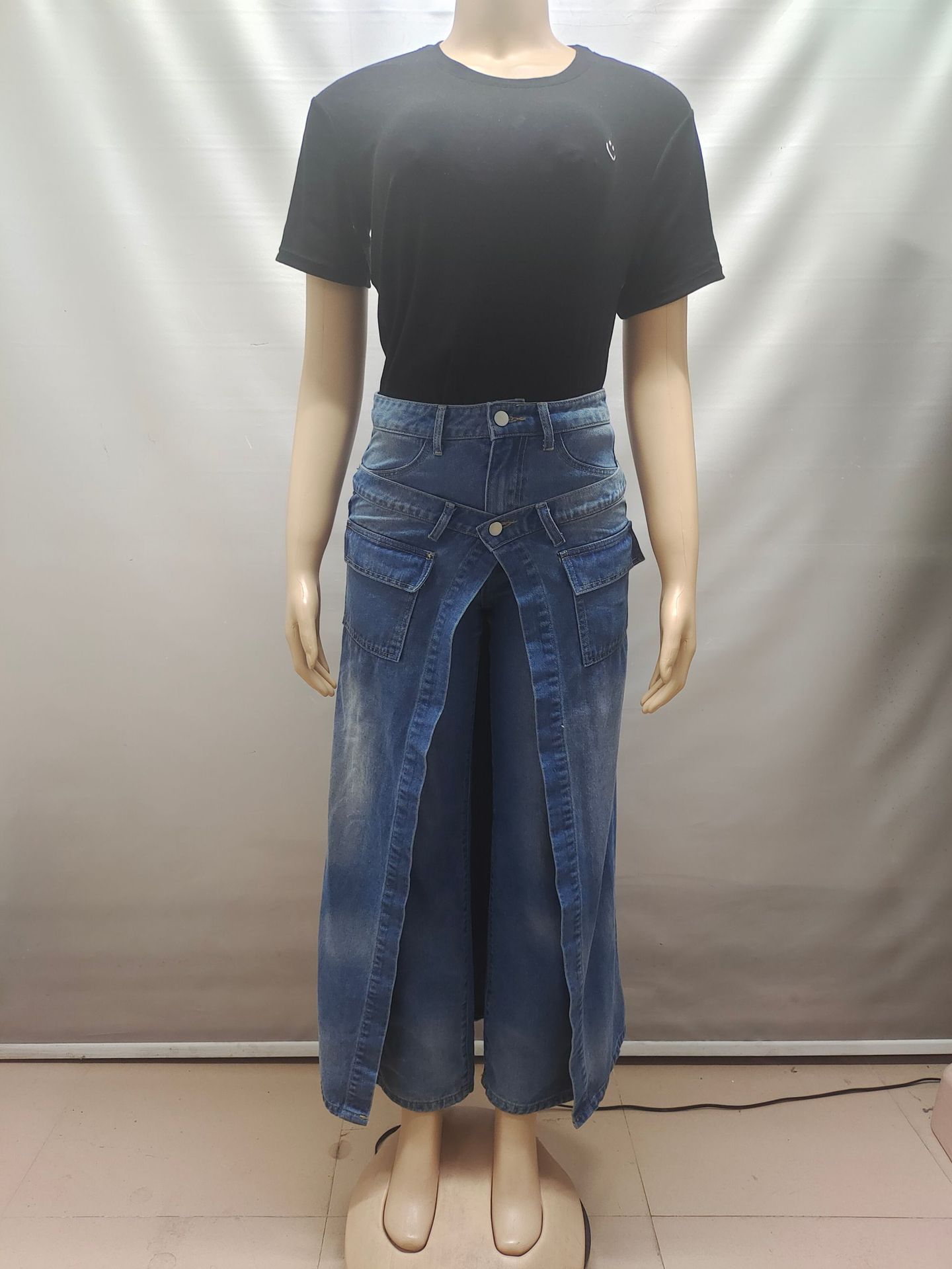 欧美女式假两件牛仔裤裙 亚马逊跨境女装街头潮流对称开衩牛仔裤