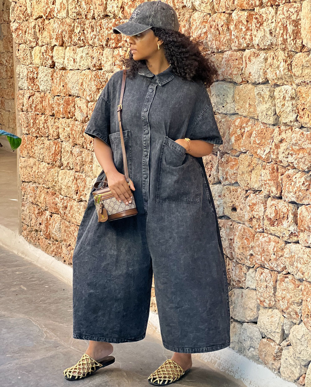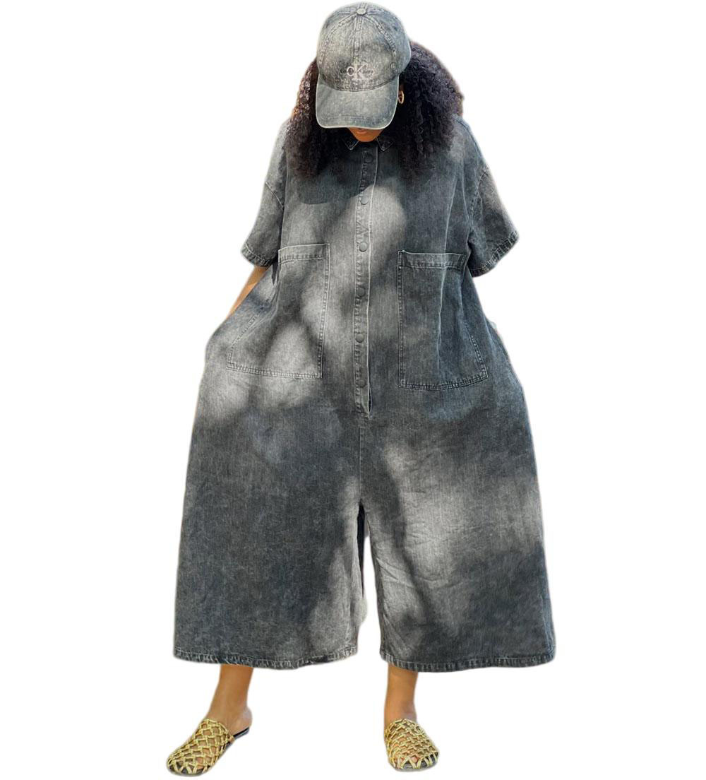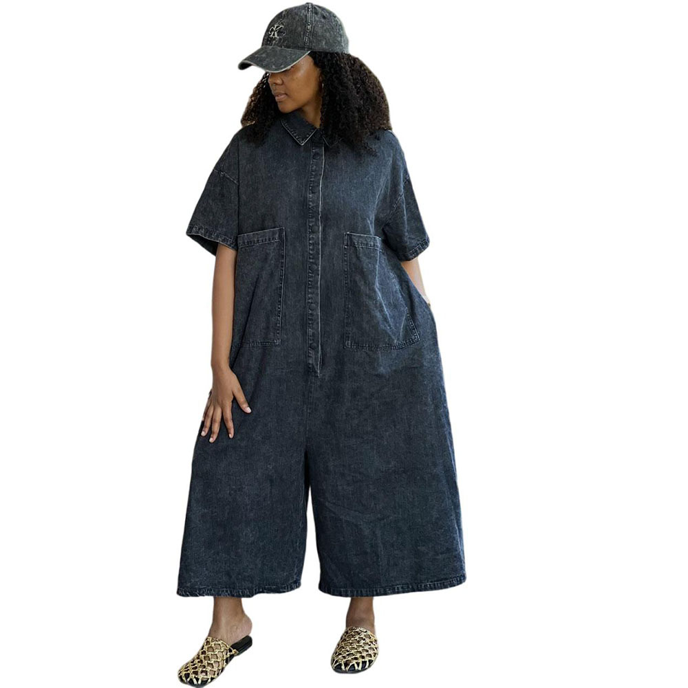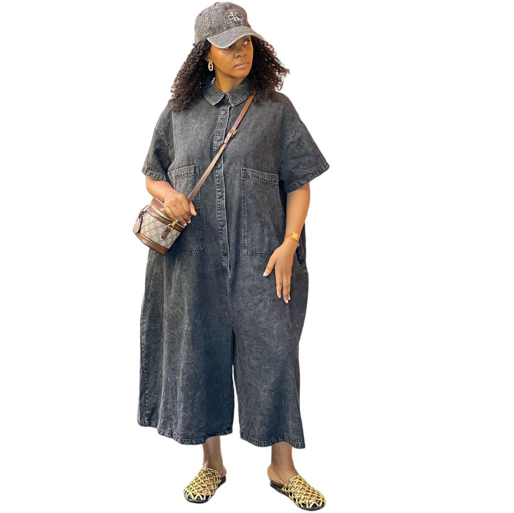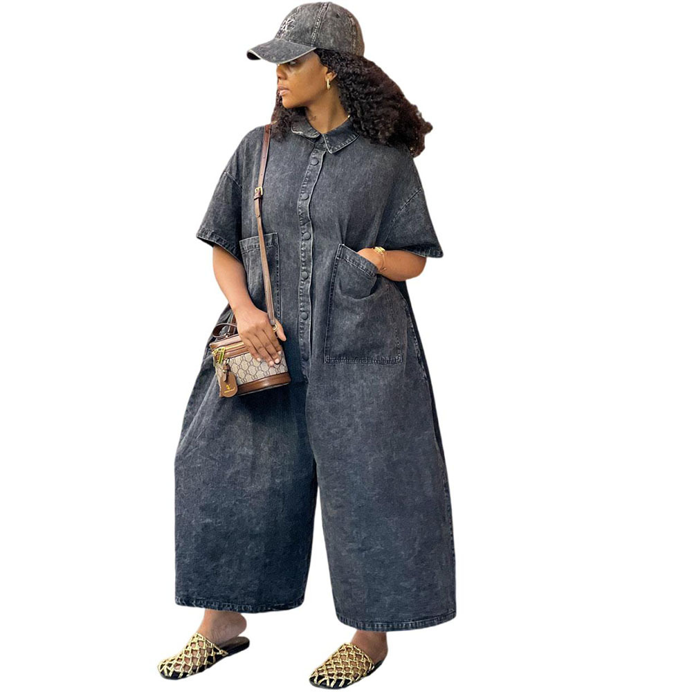 欧美女式牛仔连体裤亚马逊跨境外贸女装水洗单排扣短袖宽松连体衣
