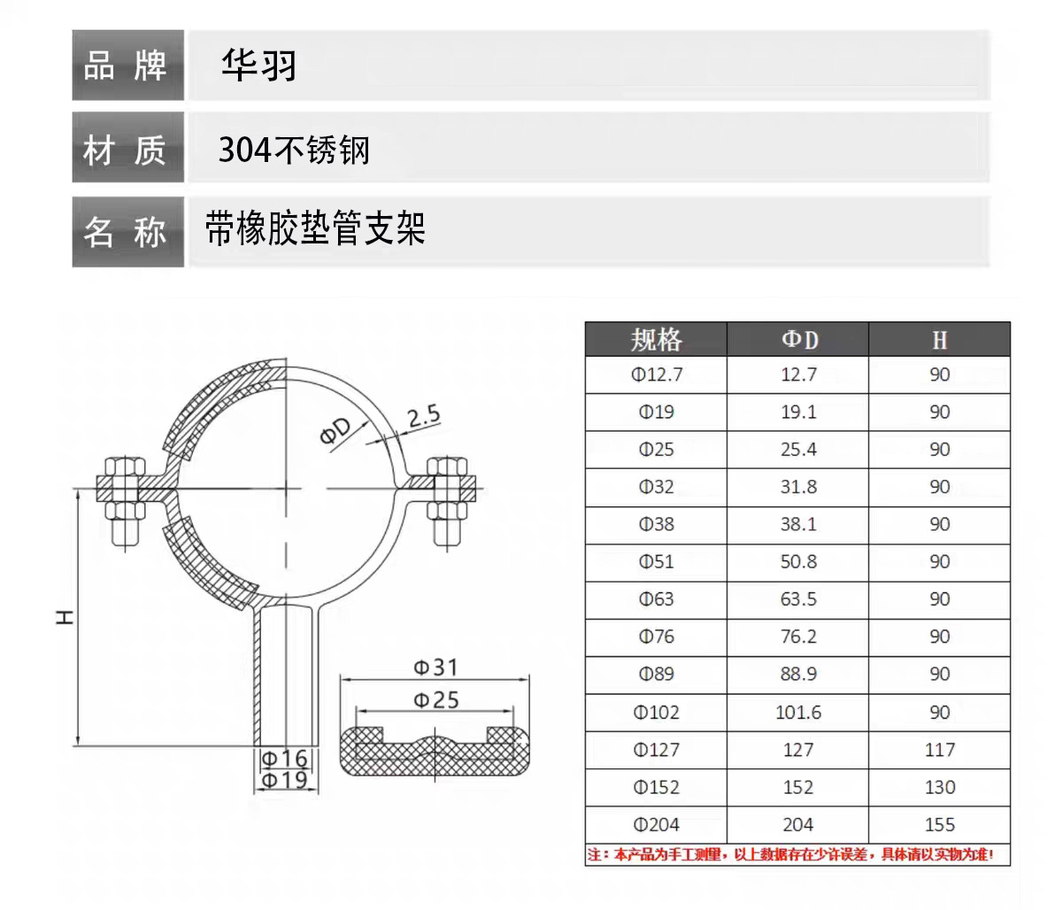 304不锈钢带胶套垫圈卫生级焊接管支架胶套固定管夹管托管码管箍