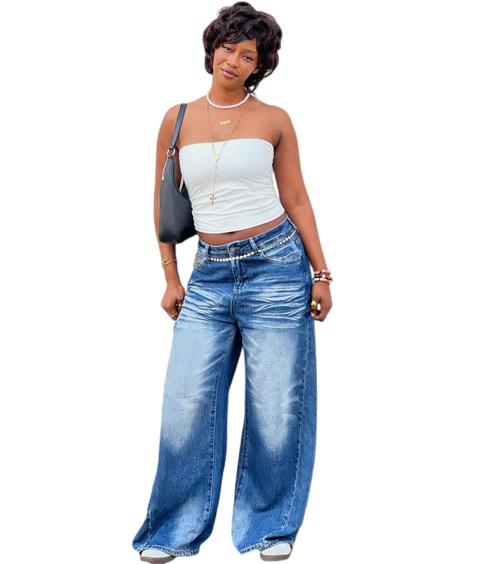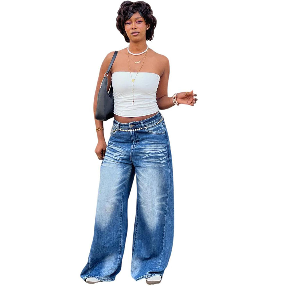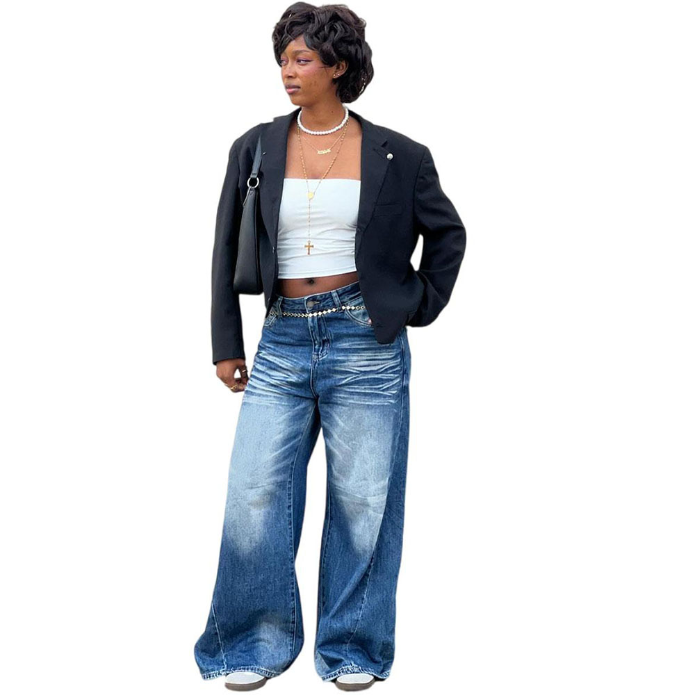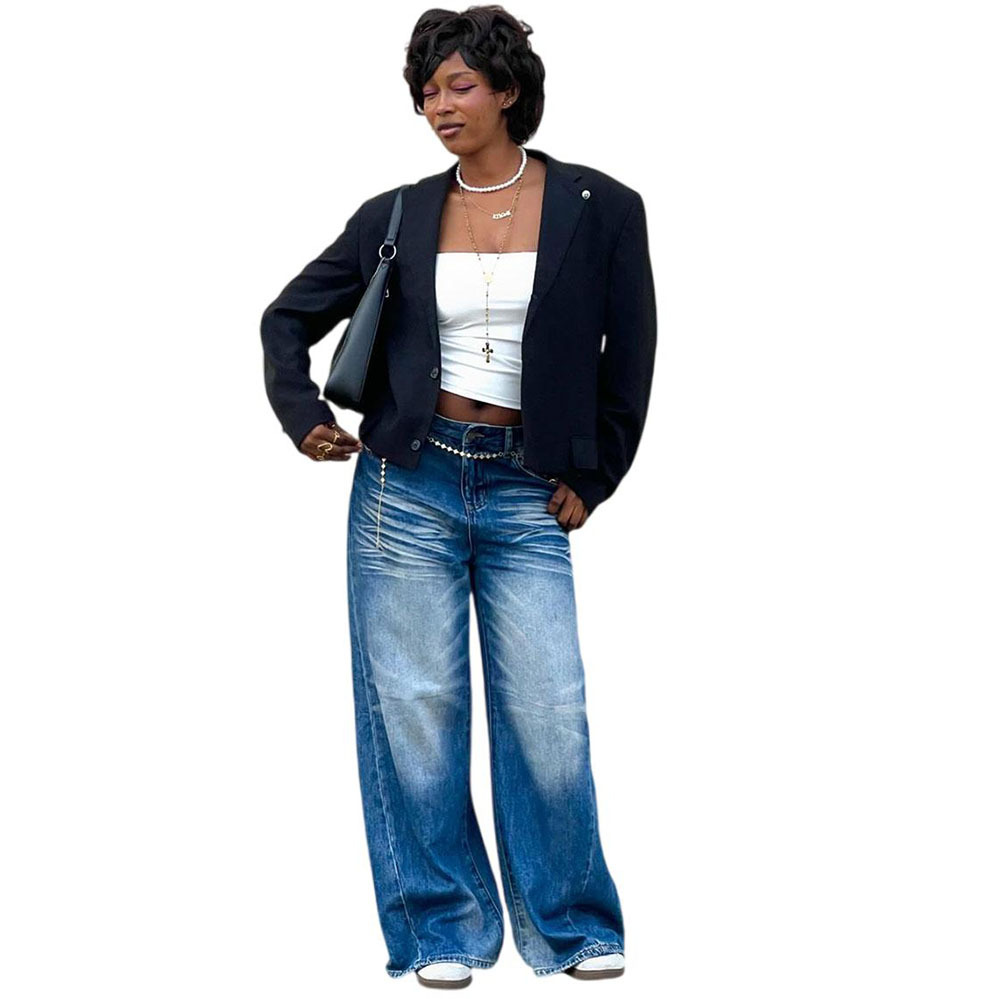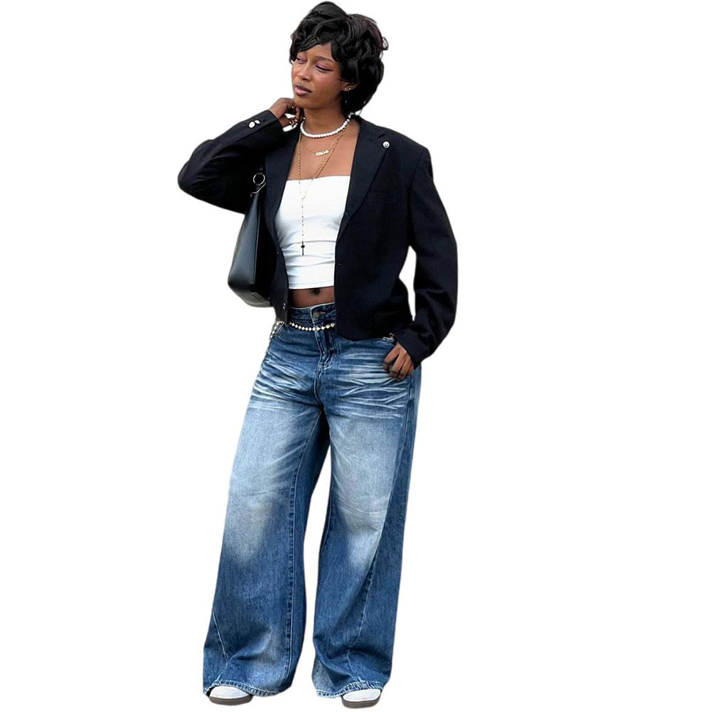 欧美女式休闲牛仔裤亚马逊跨境女装街头时尚马骝水洗阔腿休闲长裤