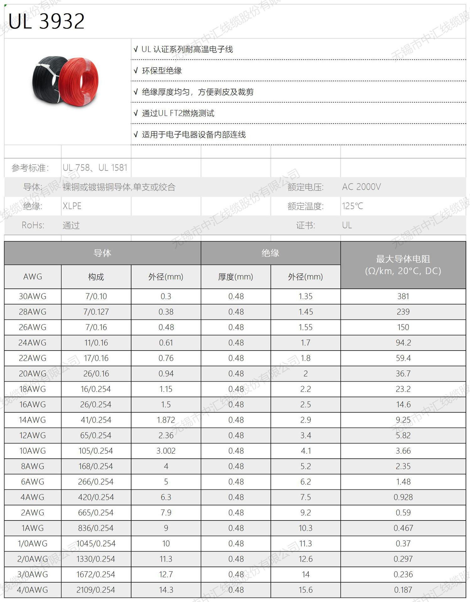 美标UL3932储能电缆镀锡铜蓄电池电线电缆裸铜芯电子线耐高温阻燃