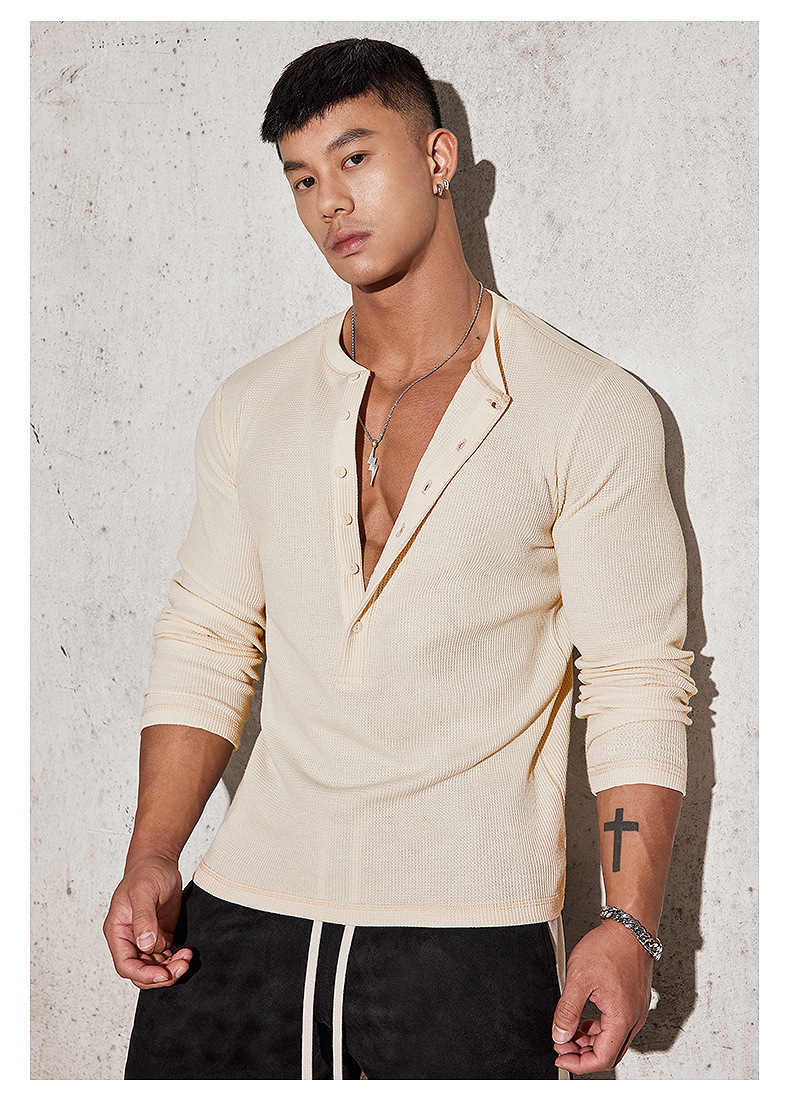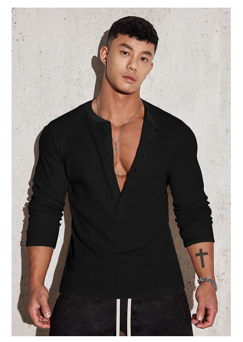 2025欧码跨境外贸男春秋运动健身休闲立领弹力纯色长袖V领POLO