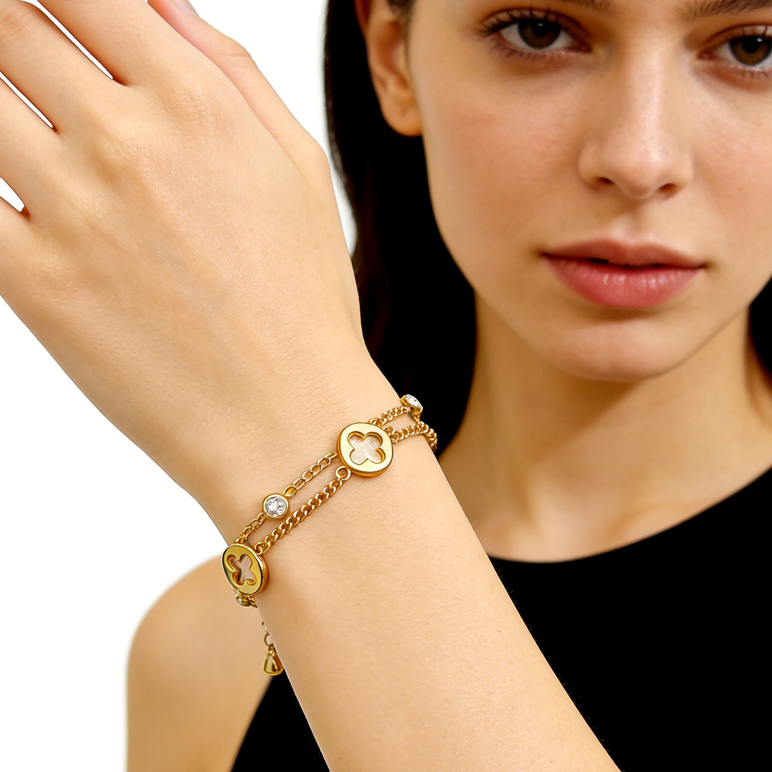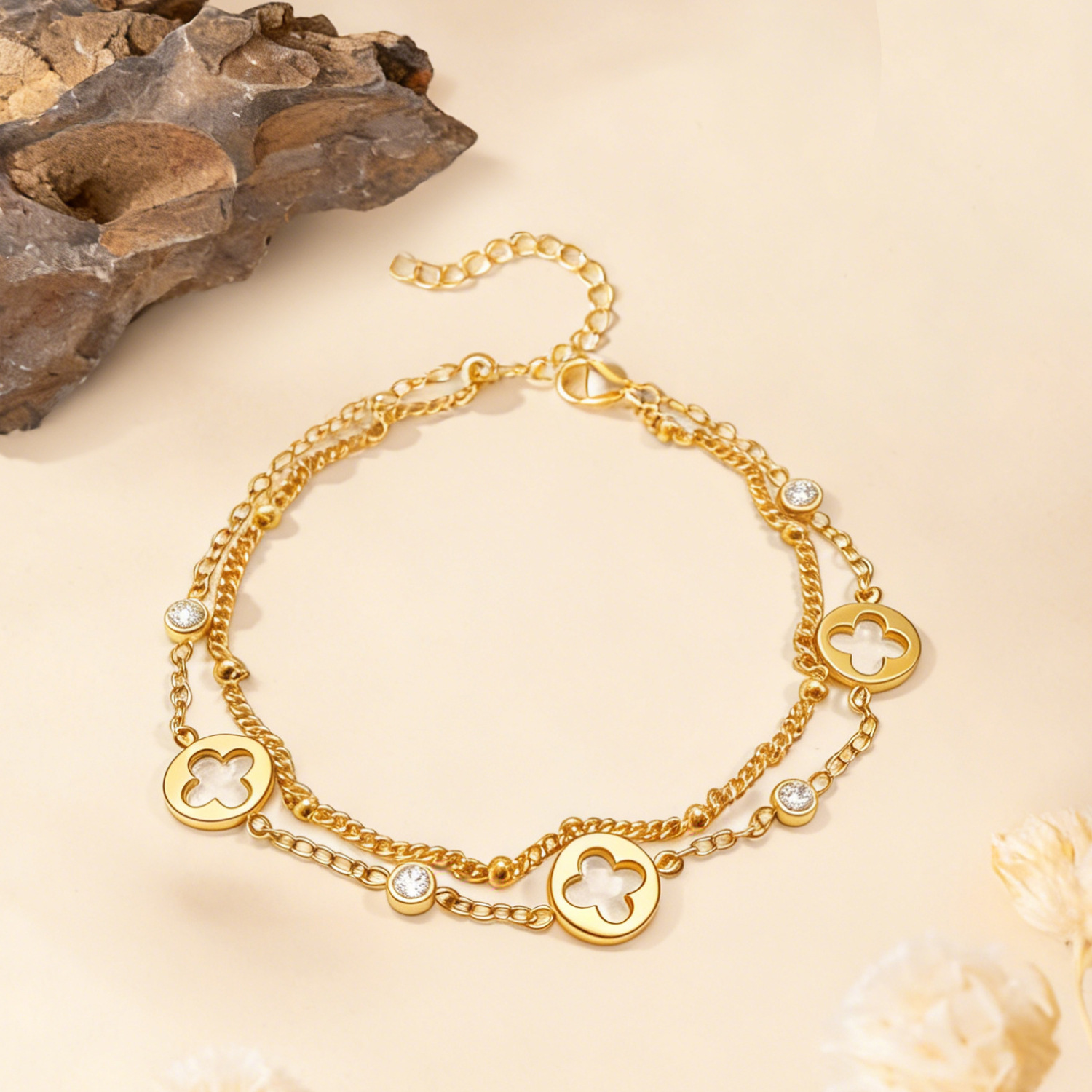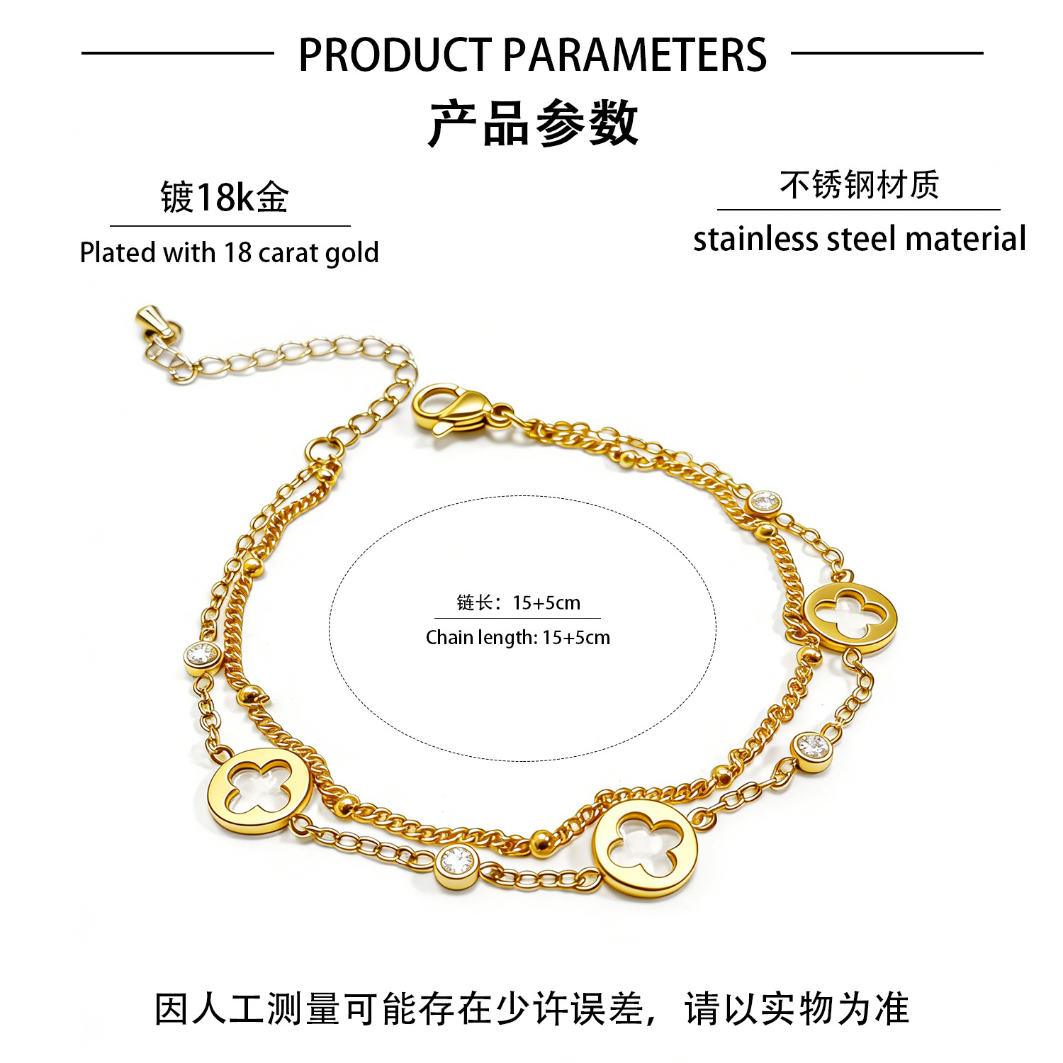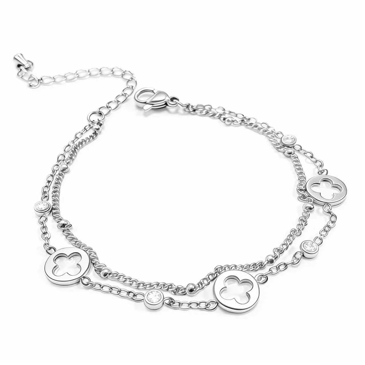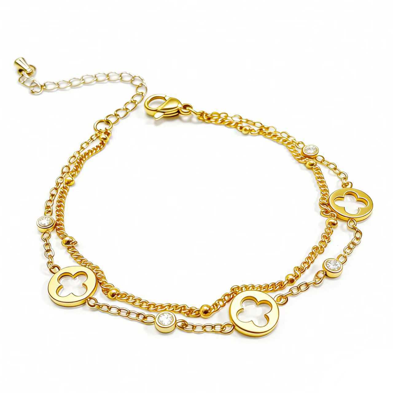 欧美风幸运四叶草双层手链女18K镀金镶钻钛钢手饰 跨境电商货批发