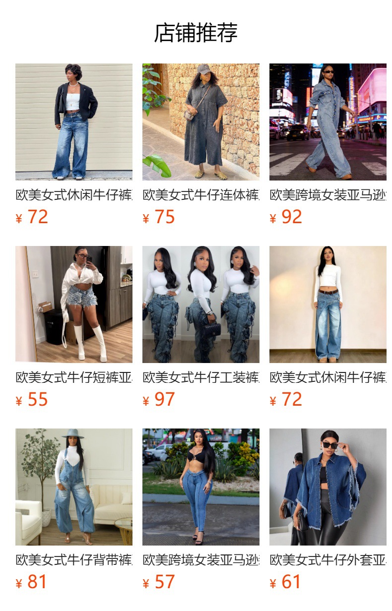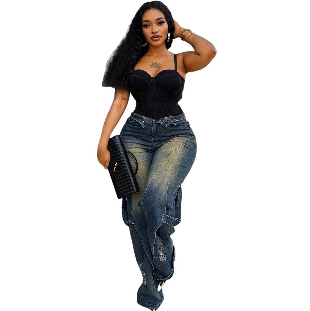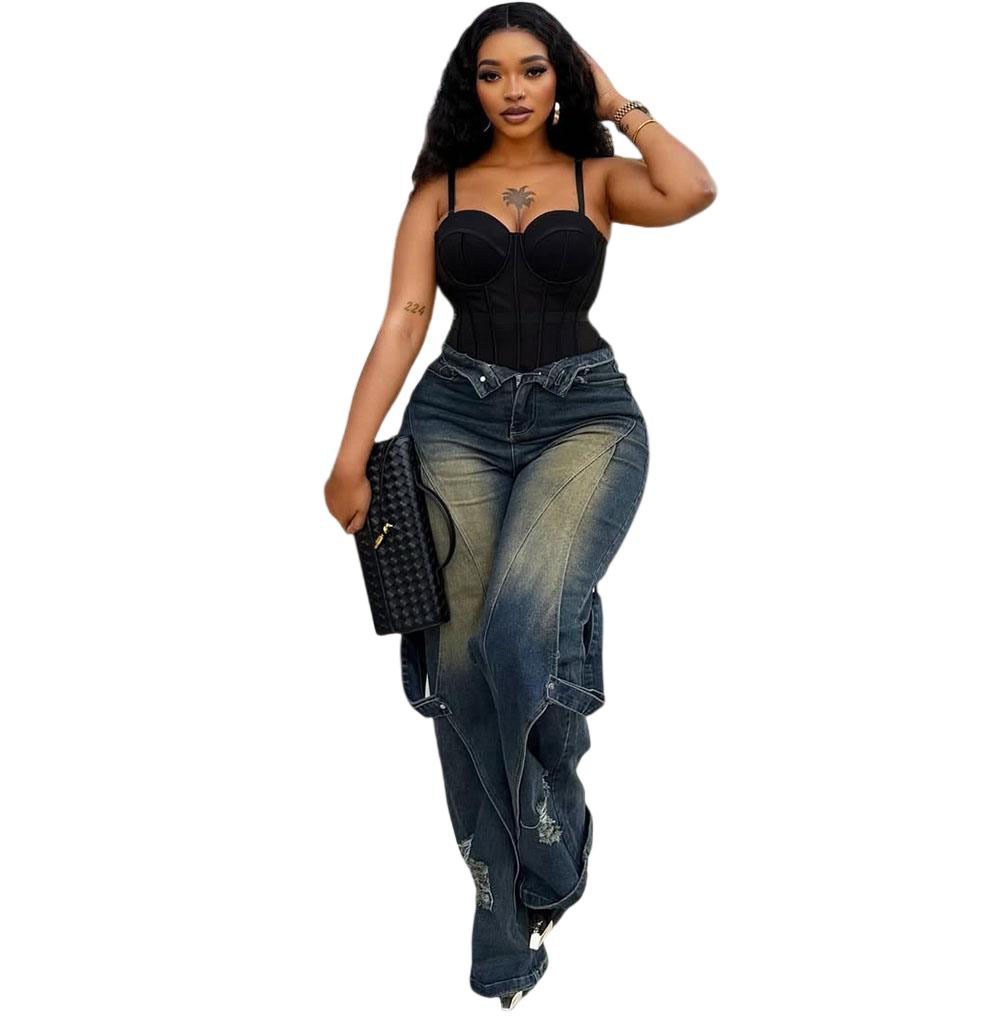 欧美女式阔腿牛仔裤 亚马逊跨境女装时尚水洗扎染磨破直筒工装裤