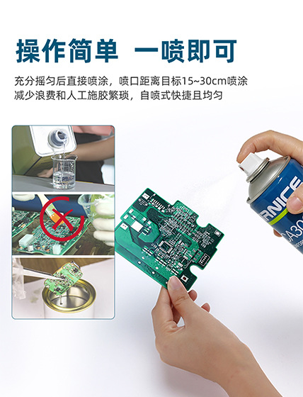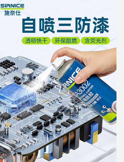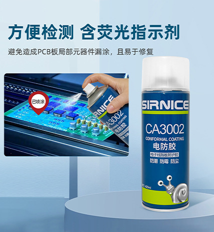 自喷三防漆 CA3002 CA3002 是一款改性丙烯酸树脂自喷三防漆,应用于厚膜电路系统、多孔基材及印刷线路板的涂层保护。是一种特殊配方的涂料,用于保护线路板及其相关设备免受环境的侵蚀,具有良好的耐高低温性能。