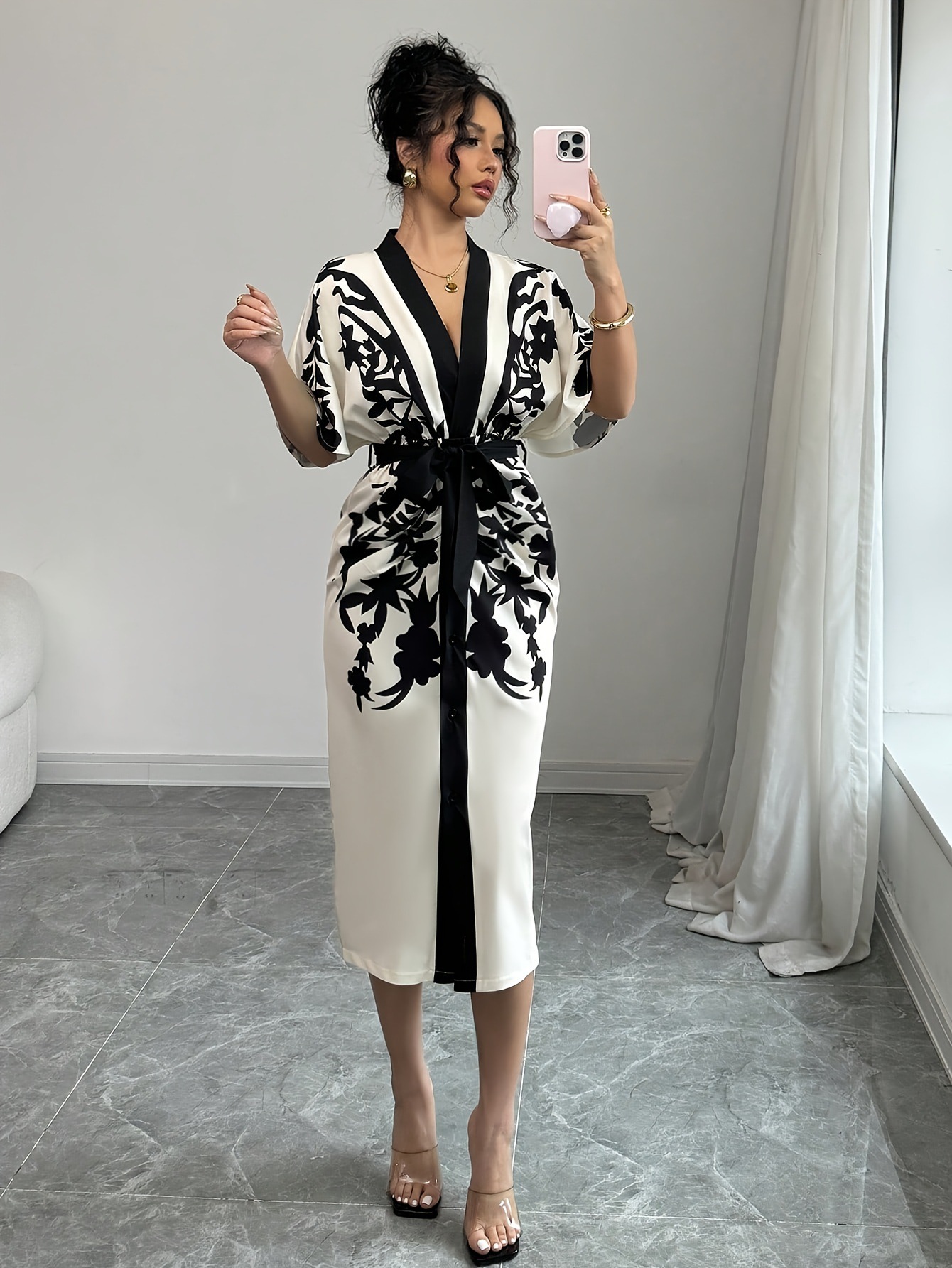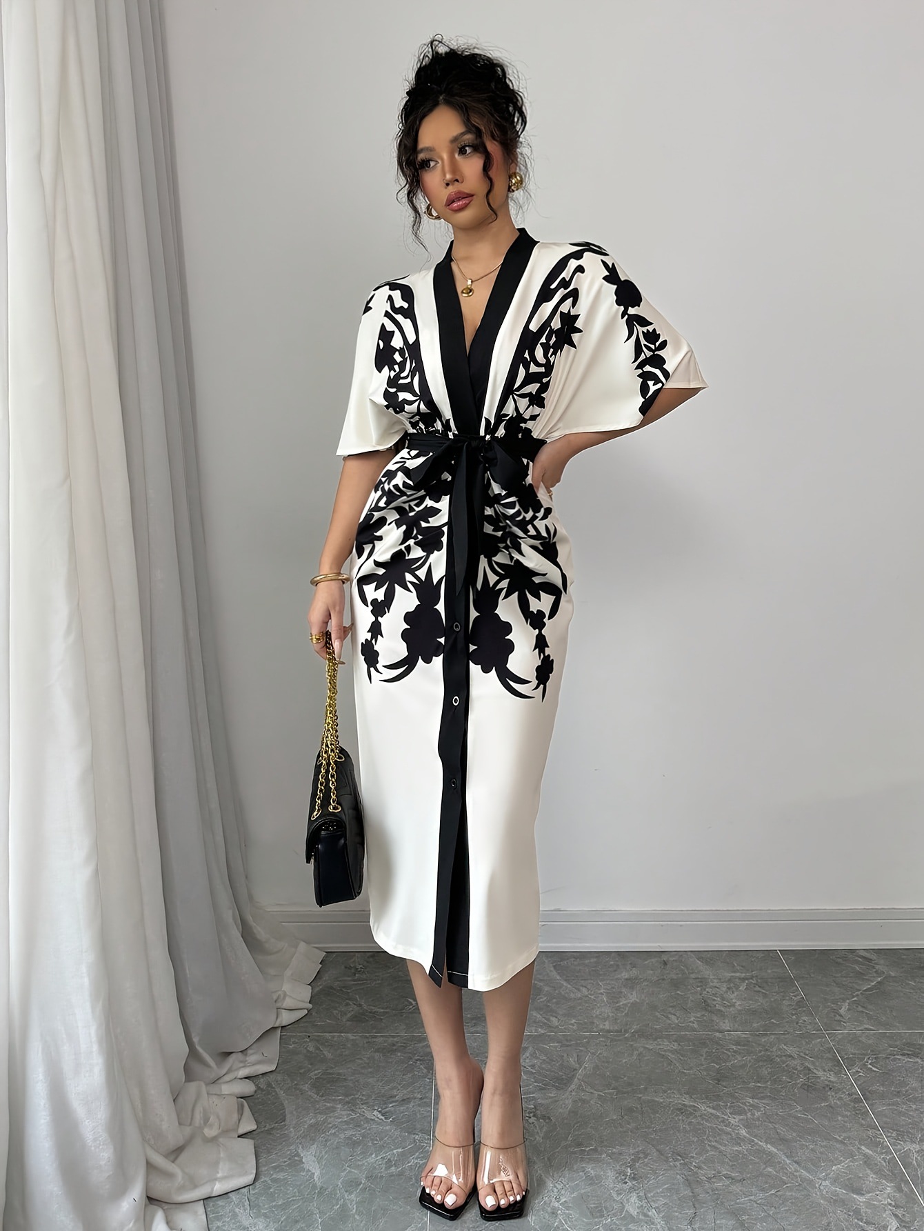 2025欧美跨境外贸女士休闲优雅短袖印花撞色连衣裙