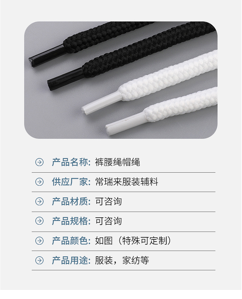 涤纶圆绳丝带挂绳男女运动裤腰带绳休闲裤卫衣帽绳金属头抽绳