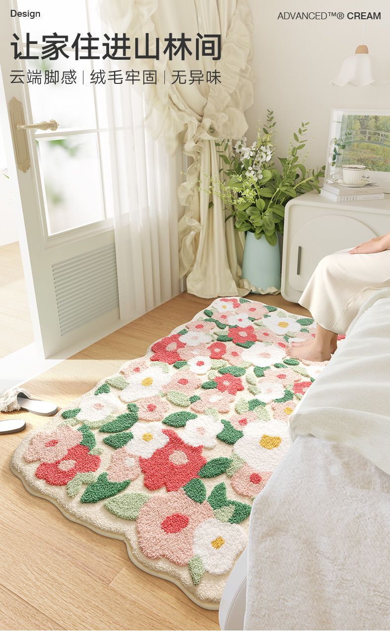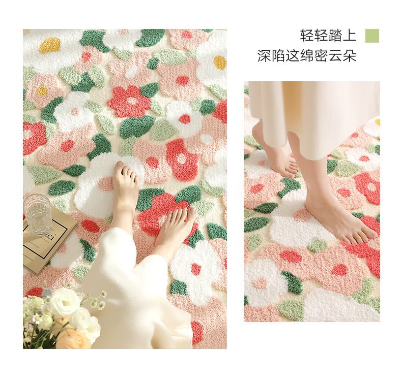 小清新花卉植绒地毯卧室床边毯家用客厅书房耐脏吸水簇绒机织家居