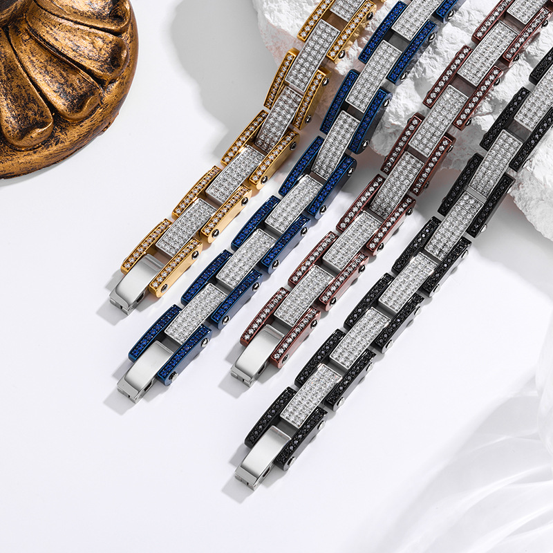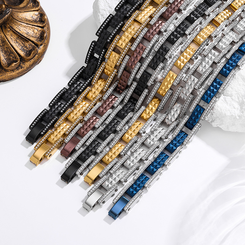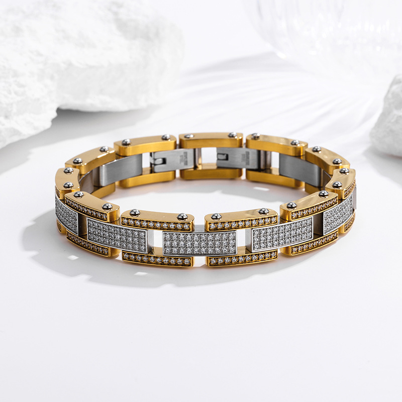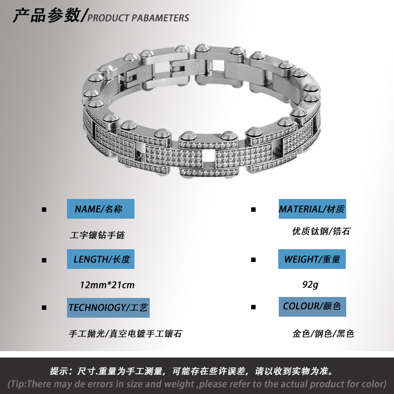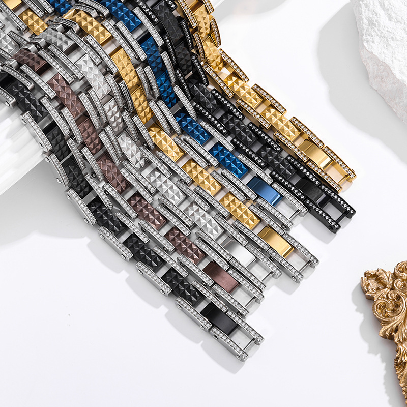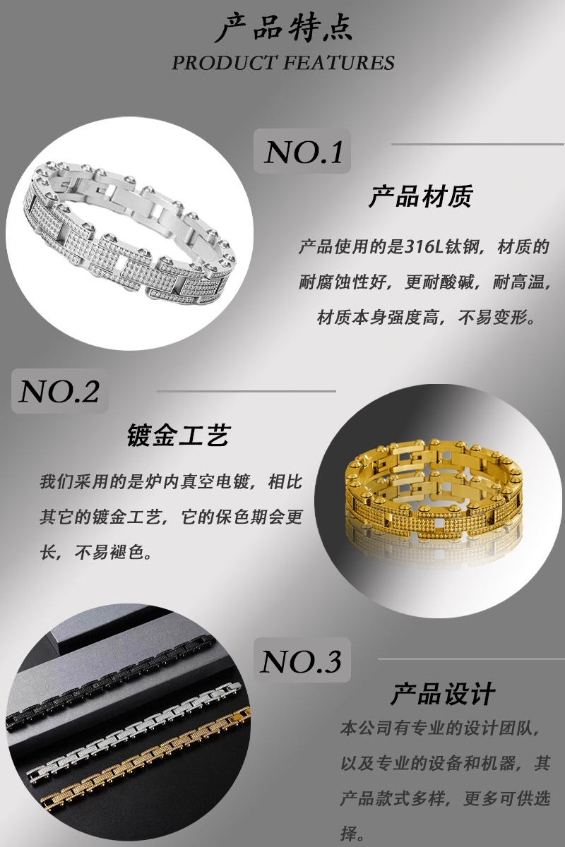 源头工厂欧美钛钢镶钻手链 316不锈钢真空18K古巴链 男士手链精品