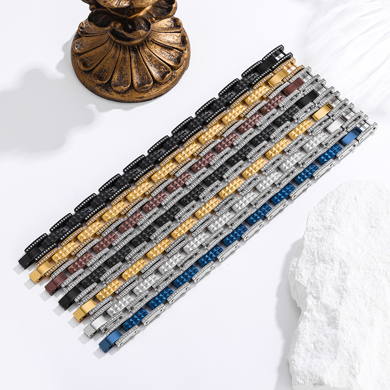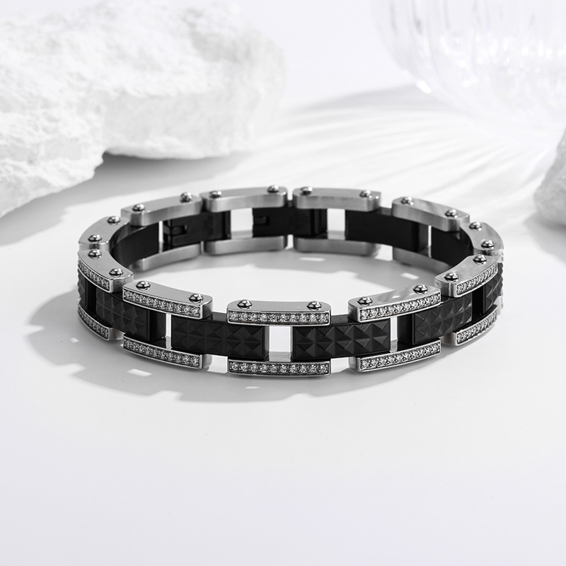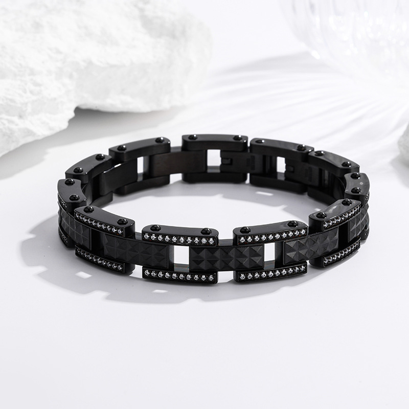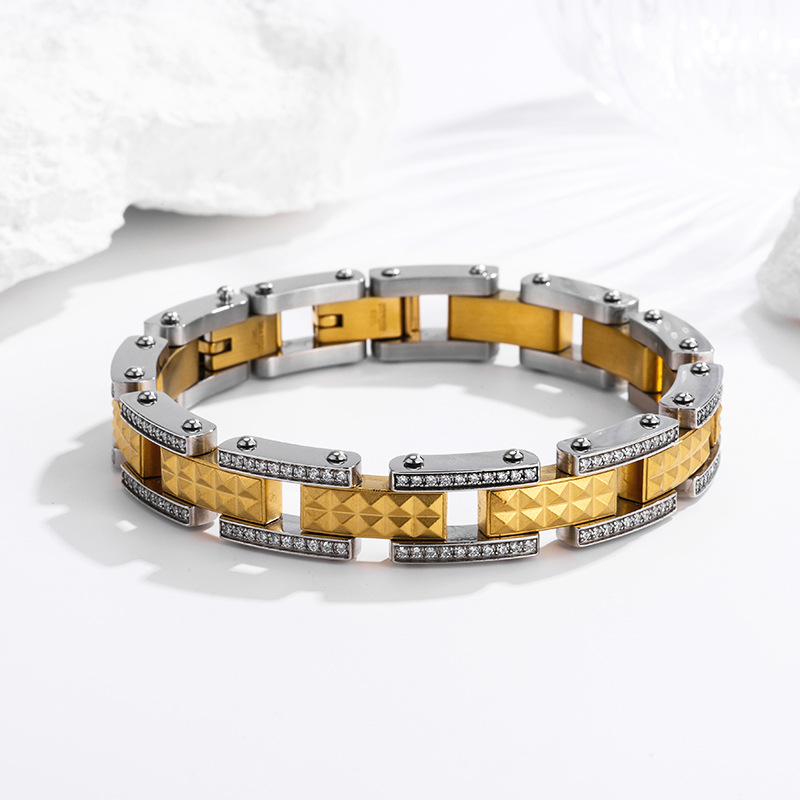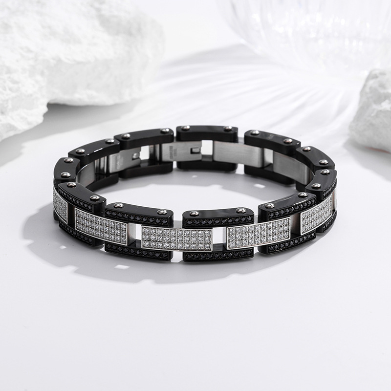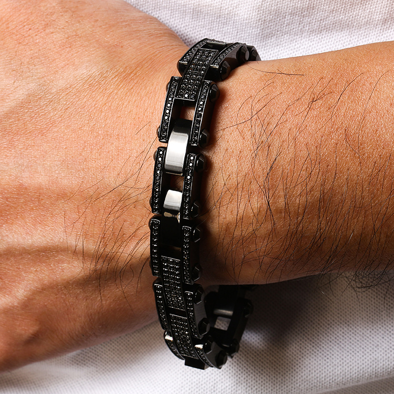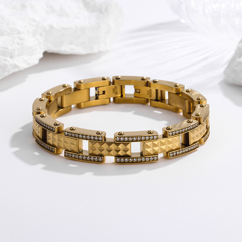 源头工厂欧美钛钢镶钻手链 316不锈钢真空18K古巴链 男士手链精品