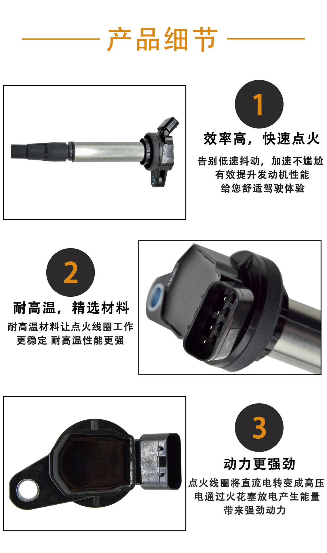 耐用材料:使用高质量绝缘材料和耐高温组件,增强点火线圈的稳定性和寿命,适应各种恶劣工作环境。