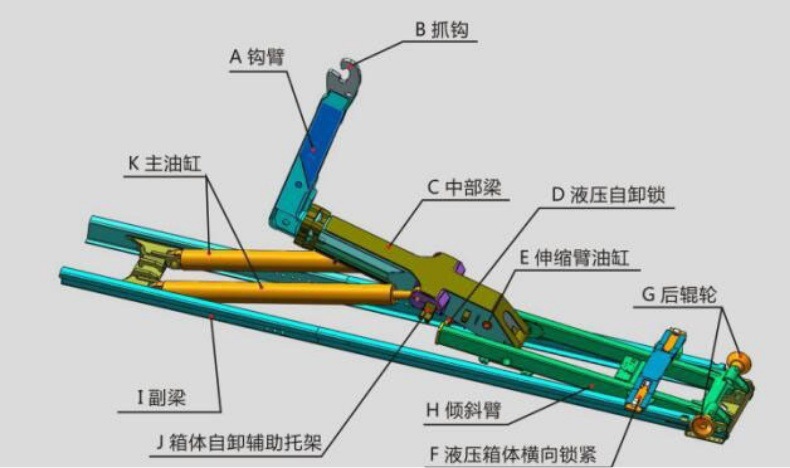 是由汽车底盘、拉臂主油缸、附车架、翻转架、支撑腿、锁紧架、锁紧油缸及多路换向阀等组成。翻转架一端连在附车架上,其另一端设有活动拉臂,中间安装有锁紧系统活动臂油缸一端连在活动臂上,另一端连接在附车架上;锁紧机构通过锁紧油缸的动作可以在箱体自卸时将附车架上的箱体与翻转架及拉臂连为一体,在主油缸伸出时形成自卸角,也可以通过锁紧油缸的收回把翻转架与附车架锁紧为一体,利用主油缸的收回或伸出使活动拉臂将地下的垃圾箱拖拉至附车架上或从附车架上放回到地