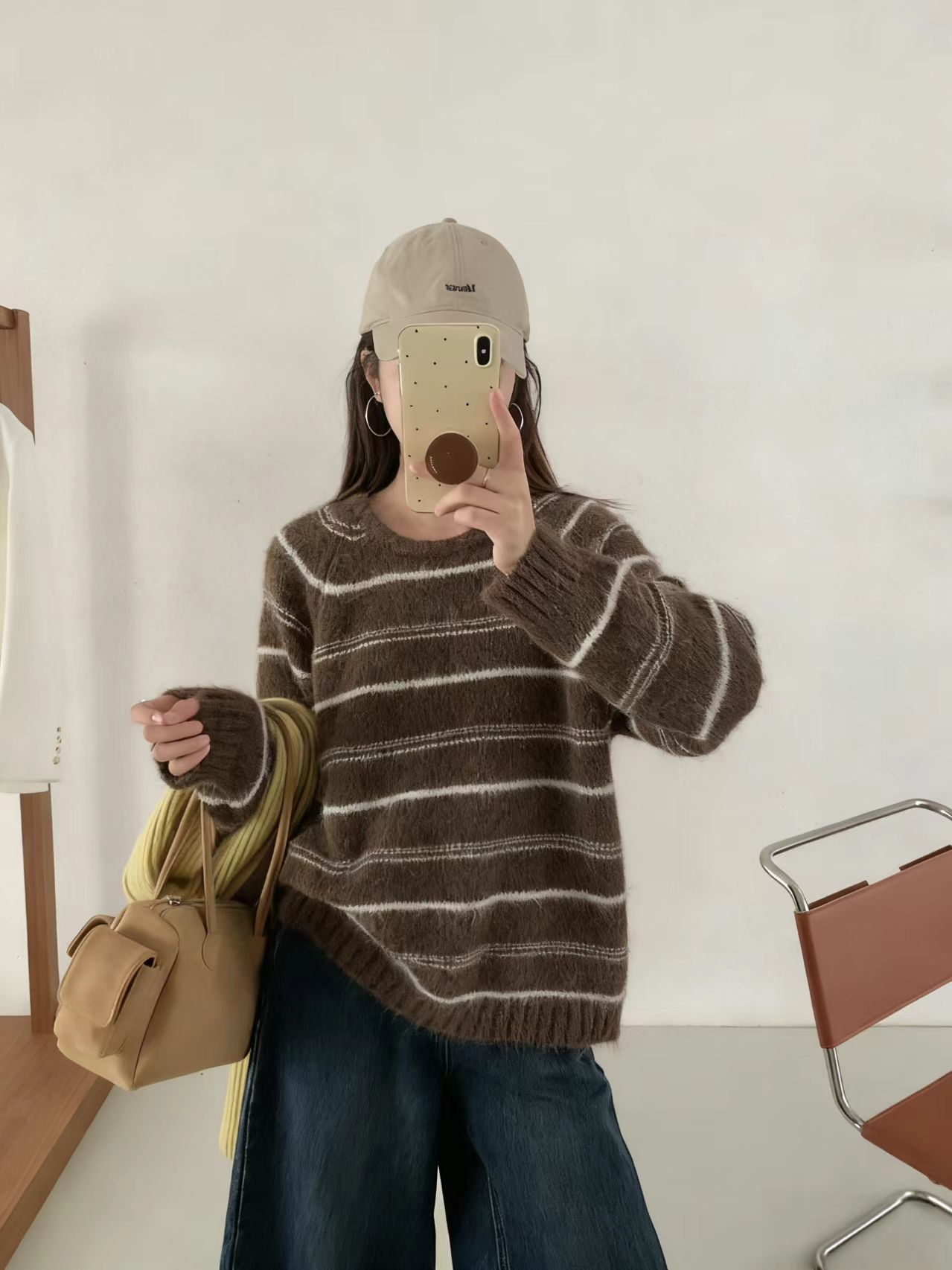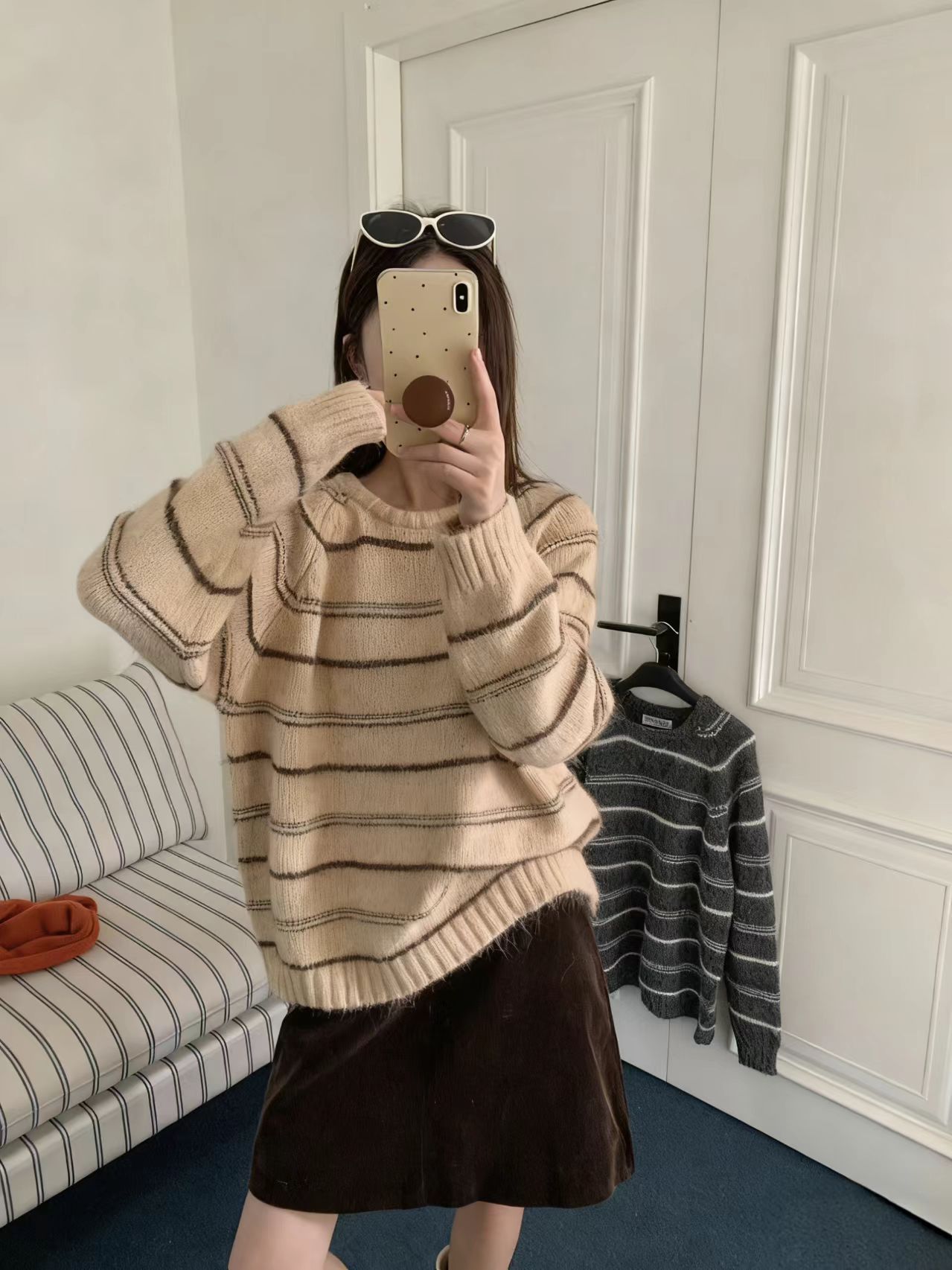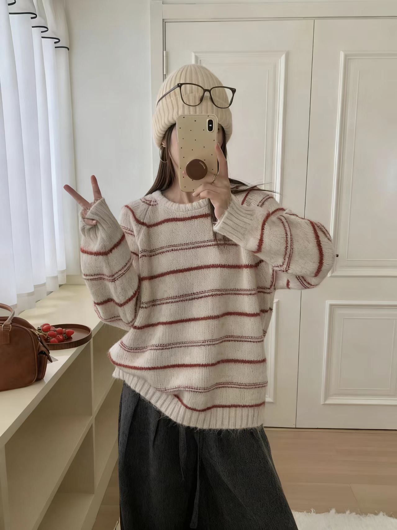 韩系撞色条纹圆领长袖毛衣女秋冬新款休闲宽松百搭复古针织衫上衣