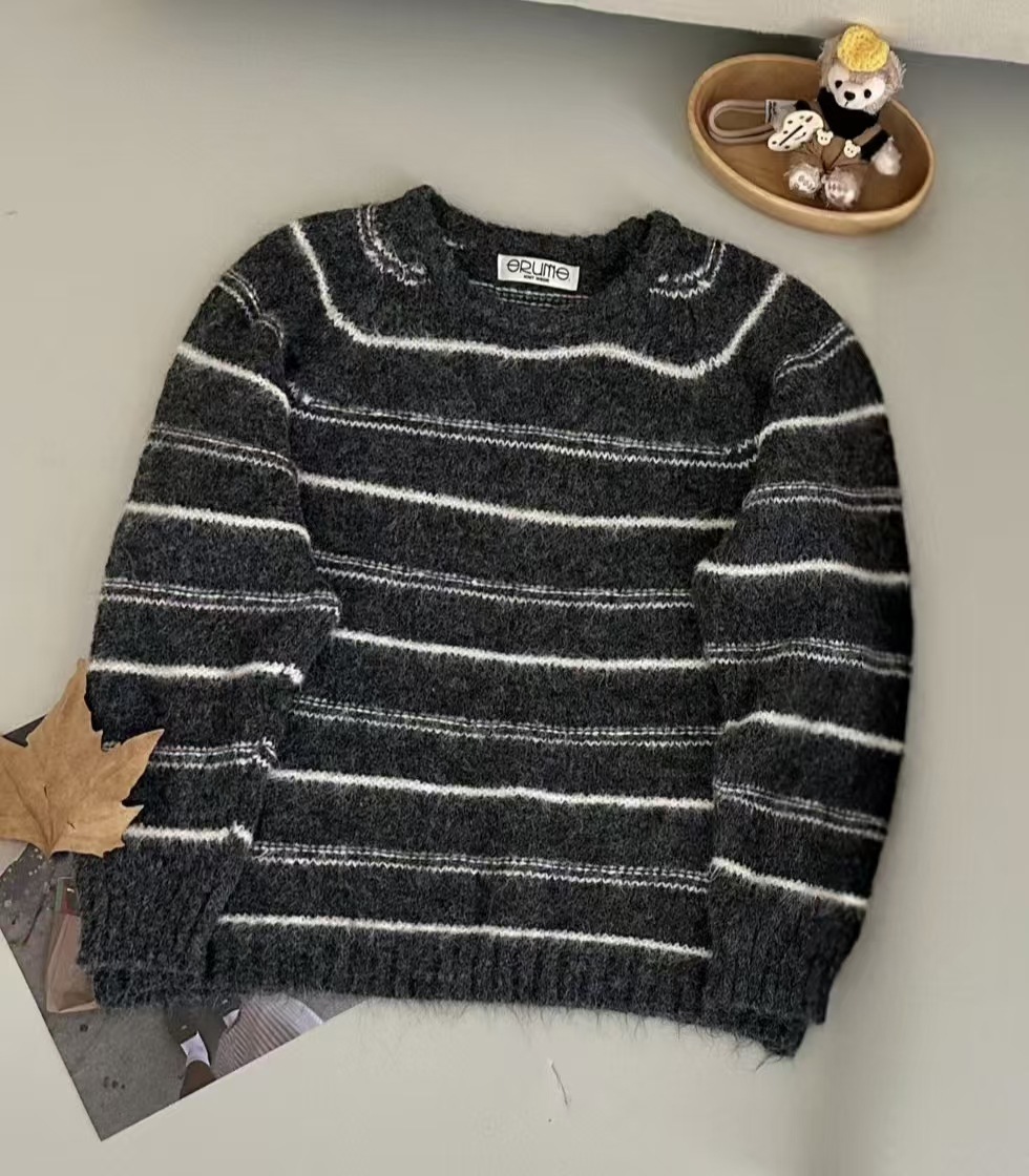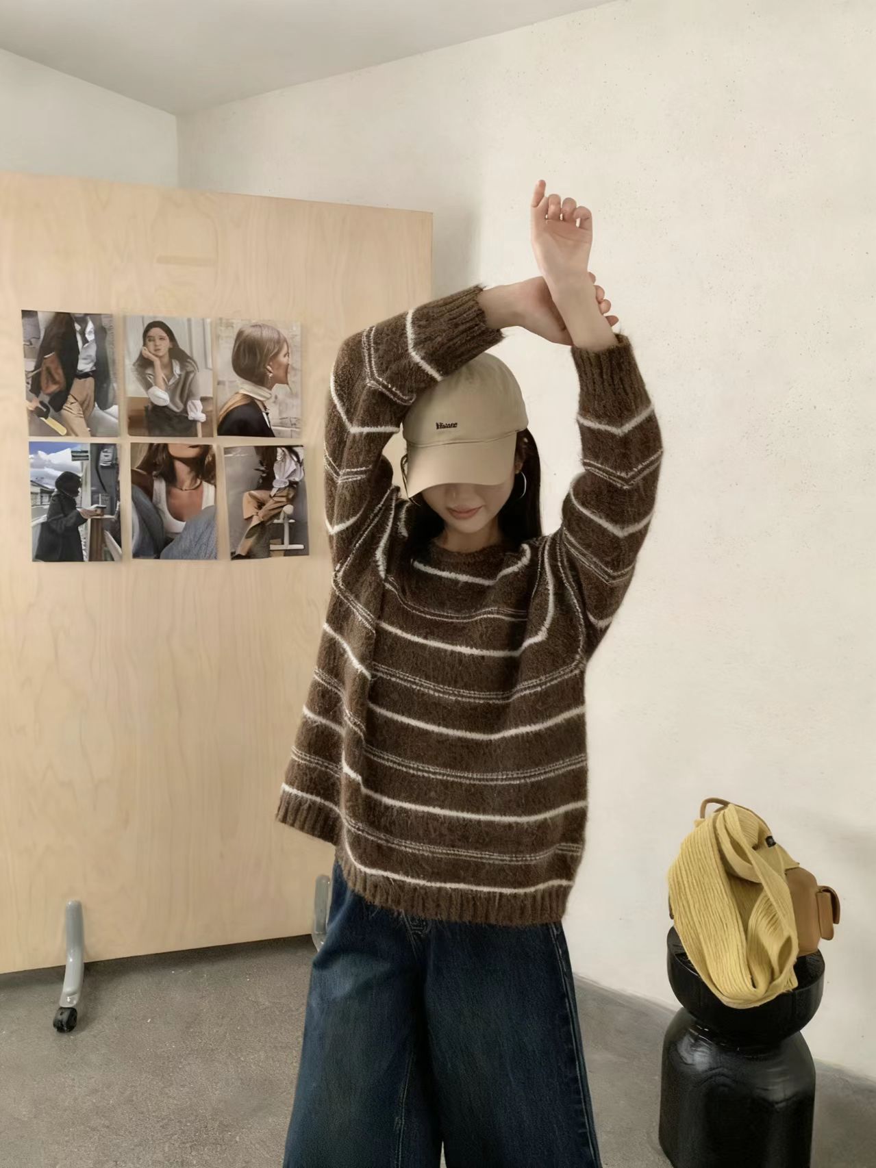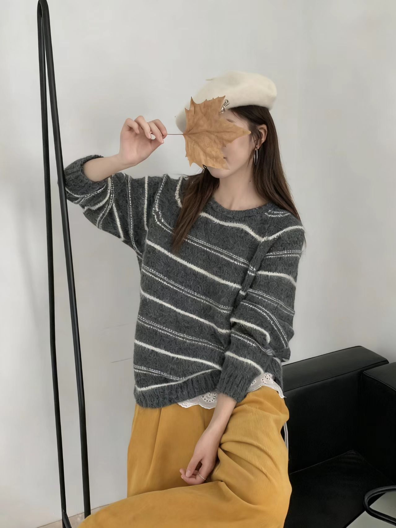 韩系撞色条纹圆领长袖毛衣女秋冬新款休闲宽松百搭复古针织衫上衣