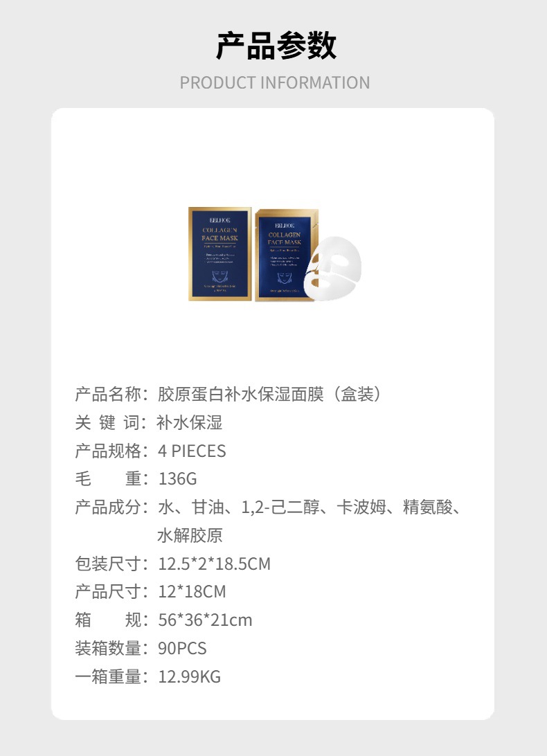 关键词:胶原蛋白,补水保湿面膜(盒装),温和滋润,轻盈透气,贴合肌肤