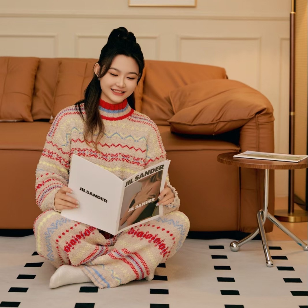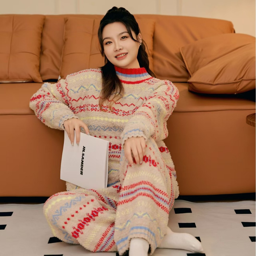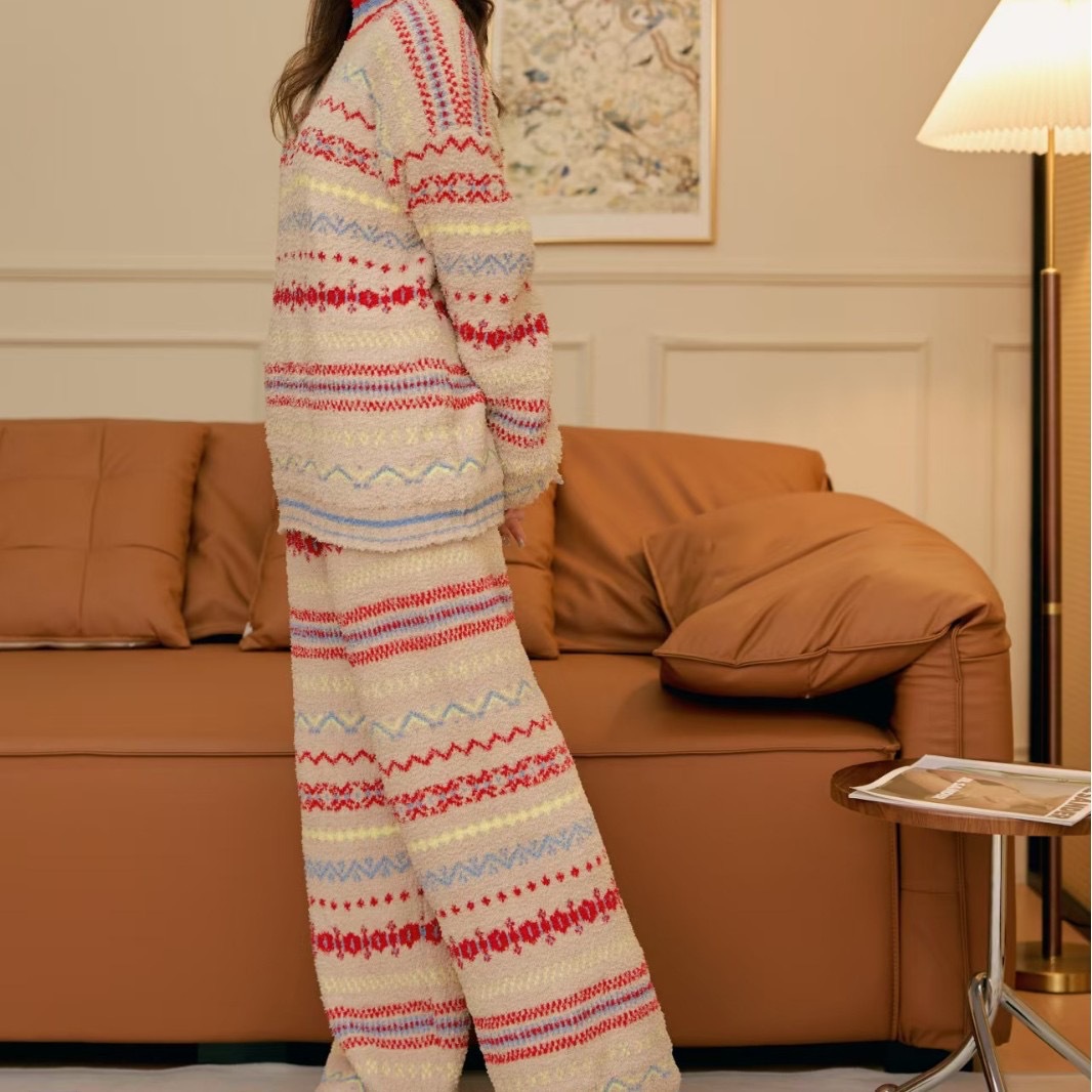 秋冬半边绒睡衣女加厚保暖国风休闲条纹家居服套装可外穿冬季新款