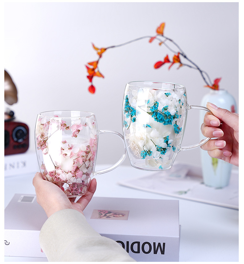 跨境新款代发双层真花杯高颜值咖啡杯高硼硅双层玻璃杯热卖爆款销