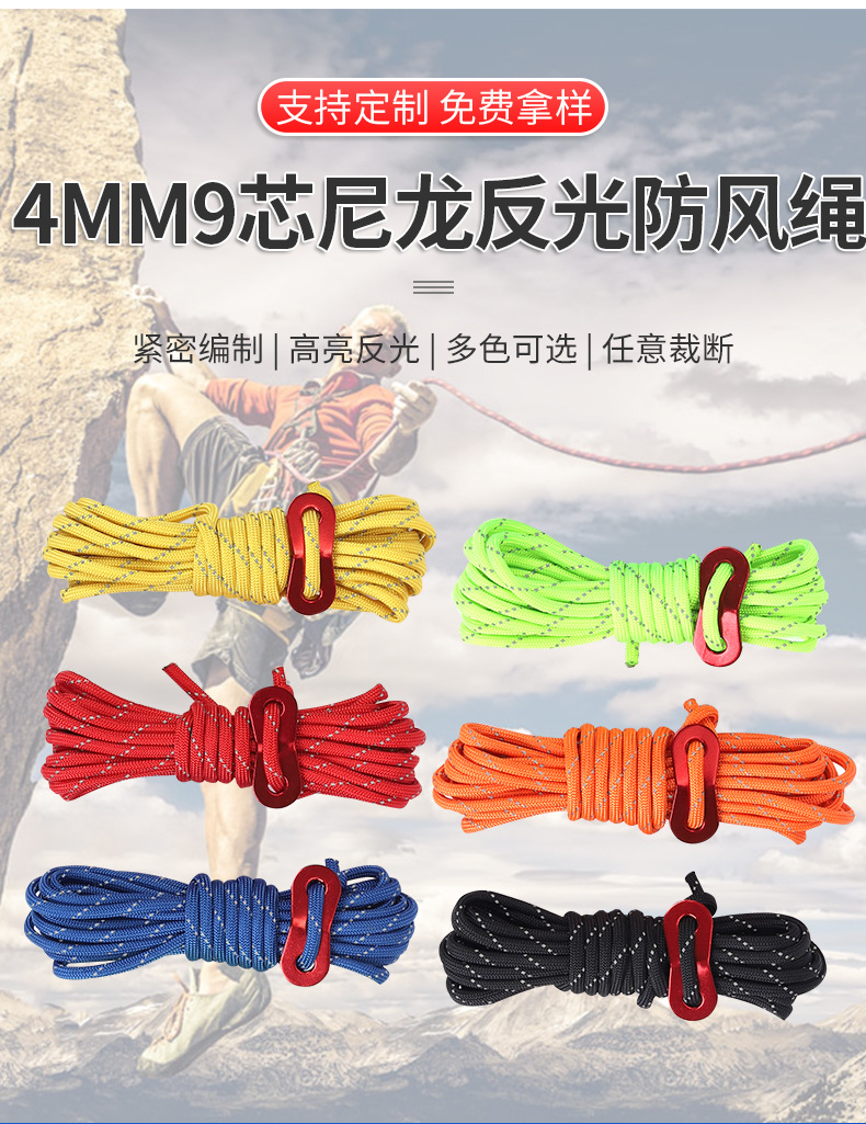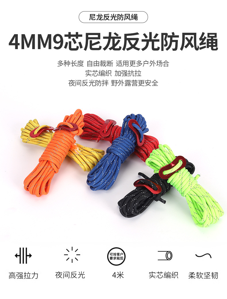 尼龙反光防风绳4MM9芯天幕防风拉绳露营野营晾衣绳棉绳尼龙捆绑