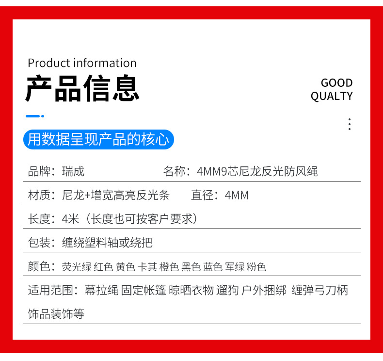 推荐理由:尼龙反光防风绳4MM9芯天幕防风拉绳露营野营晾衣绳棉绳尼龙捆绑
