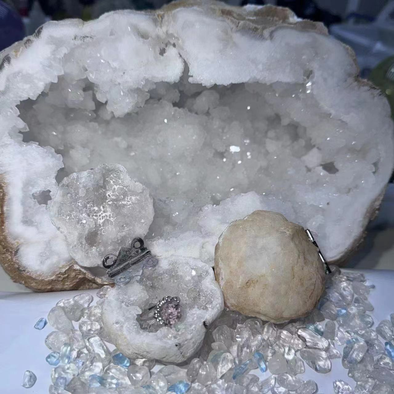 天然水晶原石白洛哥玛瑙晶洞戒指盒饰品耳钉耳环收纳摆件