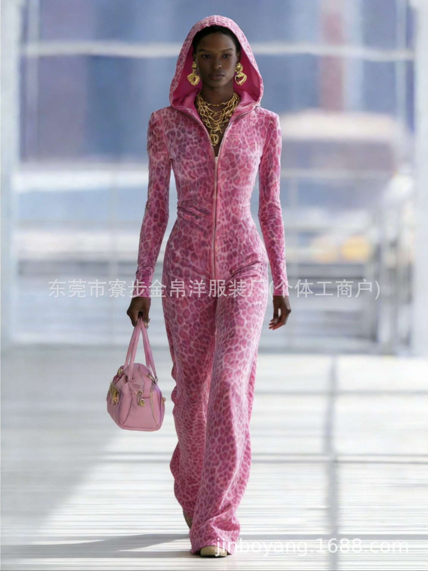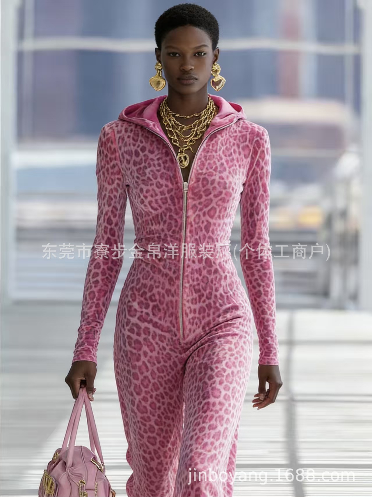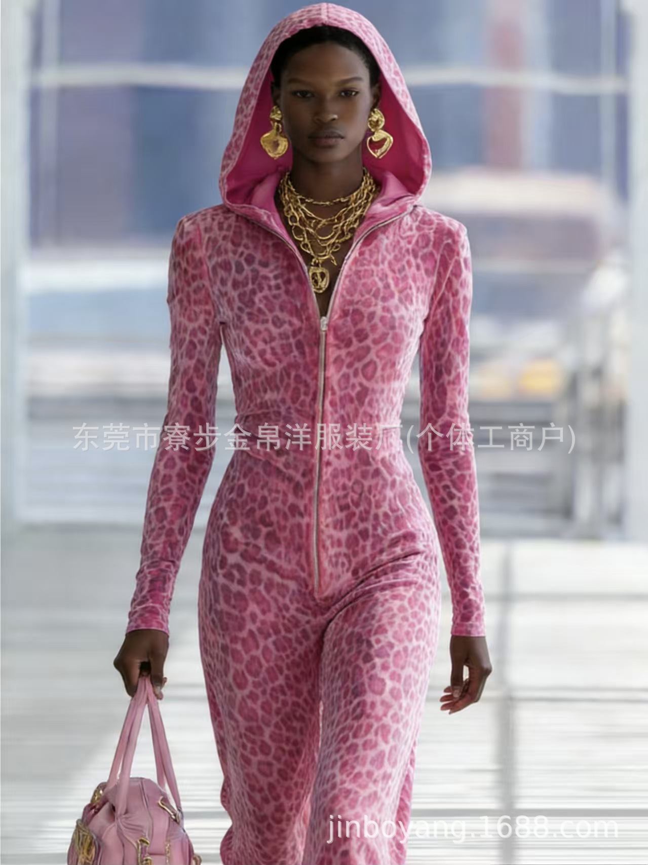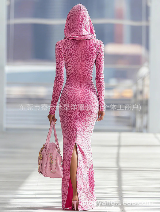新款现货欧美跨境豹纹百搭连帽性感拉链休闲套装长袖连衣裙亚马逊