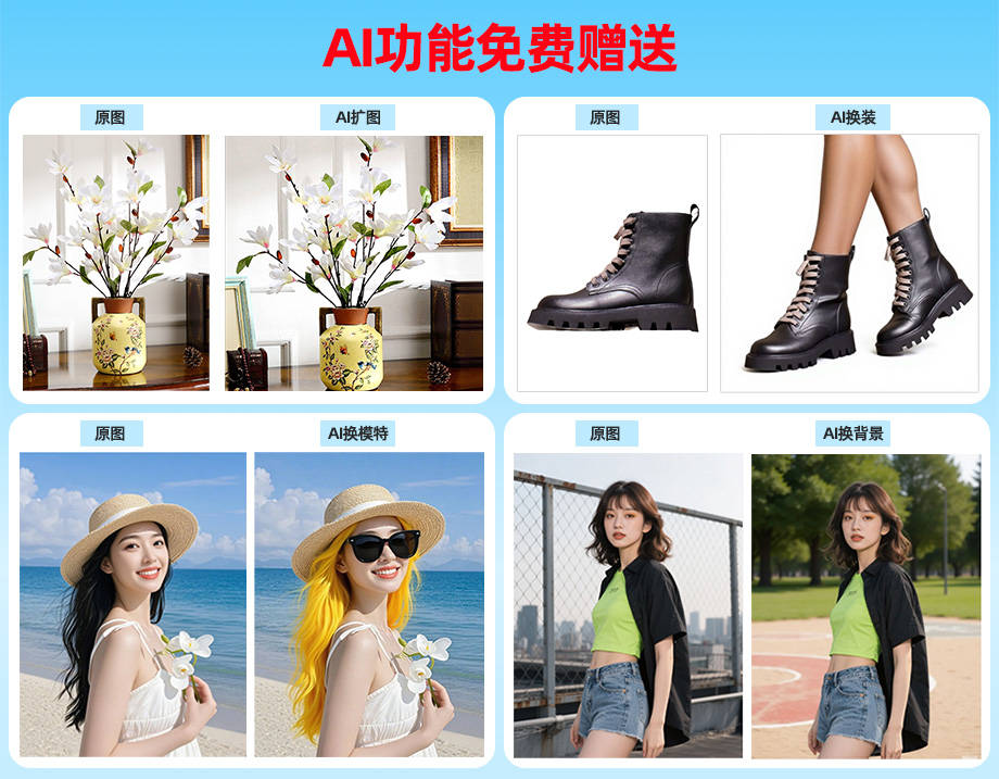 3、AI 换背景:想给商品换个背景,让它在众多商品中更亮眼,又不想重新拍图?AI 商品图功能一键就能搞定,轻松更换背景,让商品更好地贴合场景、凸显特色,吸引更多客户的目光。