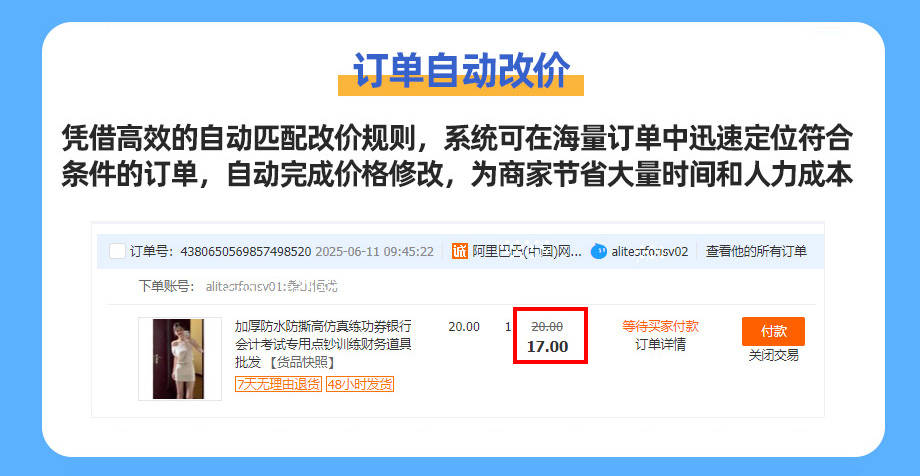 传统的手动改价方式,不仅耗费大量的时间和人力,还容易出现差错。而自动改价/满减功能通过预设规则,能够在海量订单里自动筛选出符合条件的交易,并精准完成价格修改。商家在使用该功能前,需先设置好改价规则,包括满减条件、优惠幅度等参数。规则设置完毕后,一键开启自动改价功能,系统就会按照预设规则自动执行价格调整。这一过程不仅大幅提高了工作效率,还确保了价格调整的准确性和一致性,为商家节省了可观的人力成本。