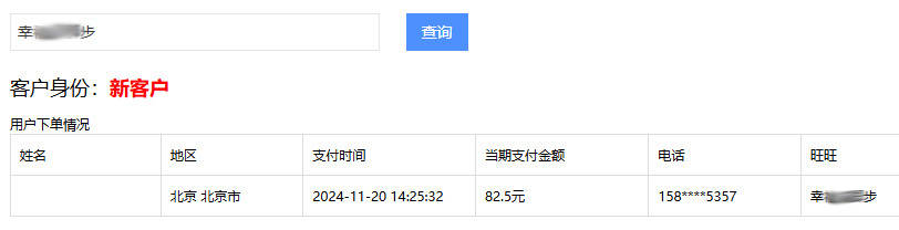 输入客户名称,还能快速判断其新老客户身份,并获取地址、支付时间、金额、电话、旺旺等下单数据。对新客户,多方式吸引其成为忠实客;对老客户,细致服务稳固关系。