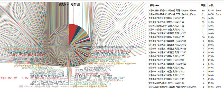 5. 商品销售分析:聚焦爆款,优化选品与推广通过 “货号分布图”“SKU 分布图”“货号 SKU 分布图” 三大可视化图表,卖家能一目了然地发现哪些商品销量领先、哪些 SKU 更受客户青睐。对于爆款产品,可加大推广力度、保障库存;对于销量低迷的商品,及时分析原因(如价格过高、款式过时),调整营销策略或优化选品,最大化提升店铺整体销售额。